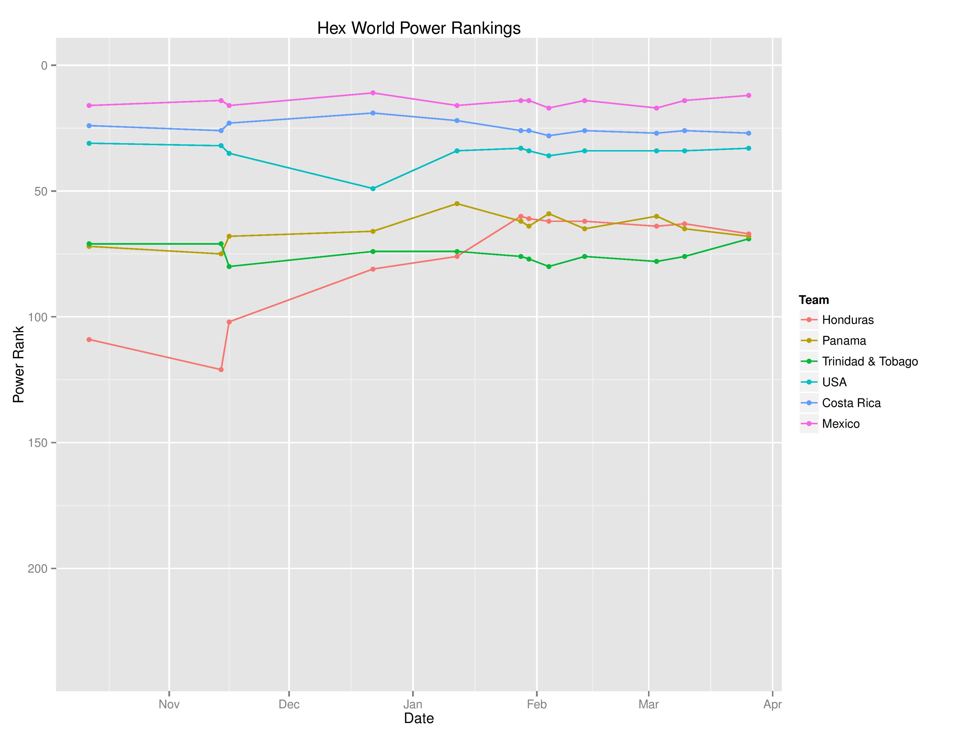 USA did not not reach Pot 1 in any of the 10,000 simulations. A lot of this is due to not having enough opportunity to ascend further in FIFA rankings. Mexico has a better chance in part due to currently being a higher rank, but also due to their qualification for the Confederations Cup, which gives a large importance multiplier in addition to top-ranking competition.