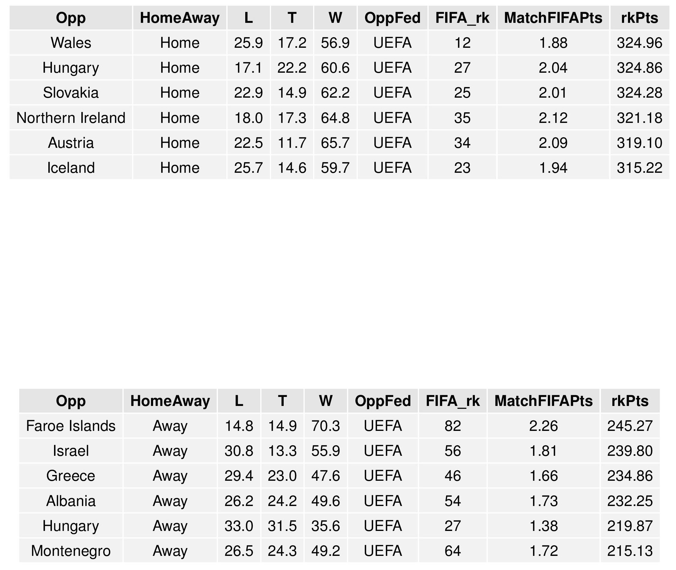 The following shows, if the USA wanted to schedule its friendlies to best manipulate the FIFA ranking system, who they should schedule against. The top table shows home matches, which are inherently the best choice for manipulating the FIFA rankings system. The bottom table shows, if the USA needs to schedule away friendlies, who they should schedule against in that scenario.