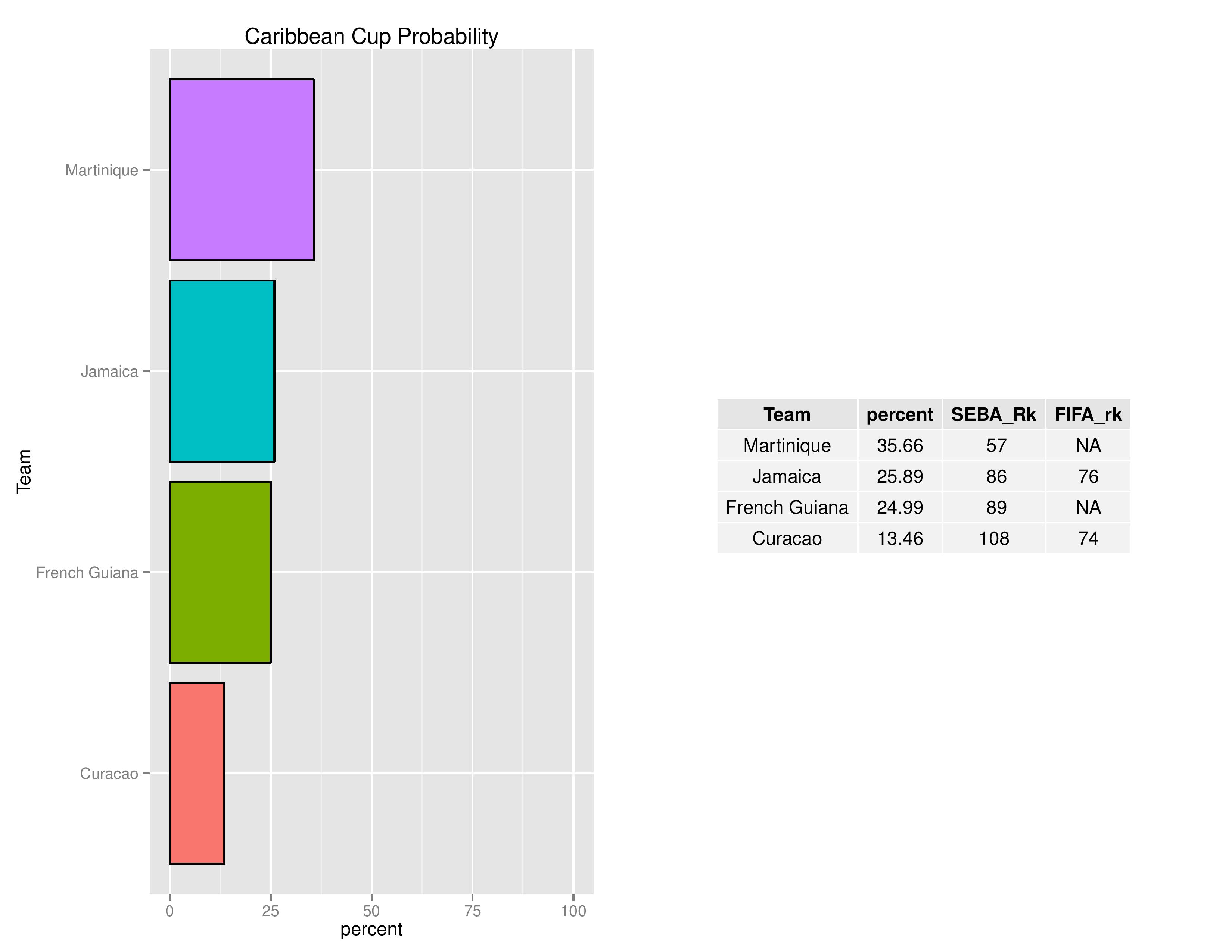 The following shows the Confederations Cup projections. CONCACAF’s representative, Mexico, has an 18.32% chance of winning.  They have the second-highest odds, thanks in part to an easier draw (with Russia, Portugal, and New Zealand) according to SEBA’s rankings.