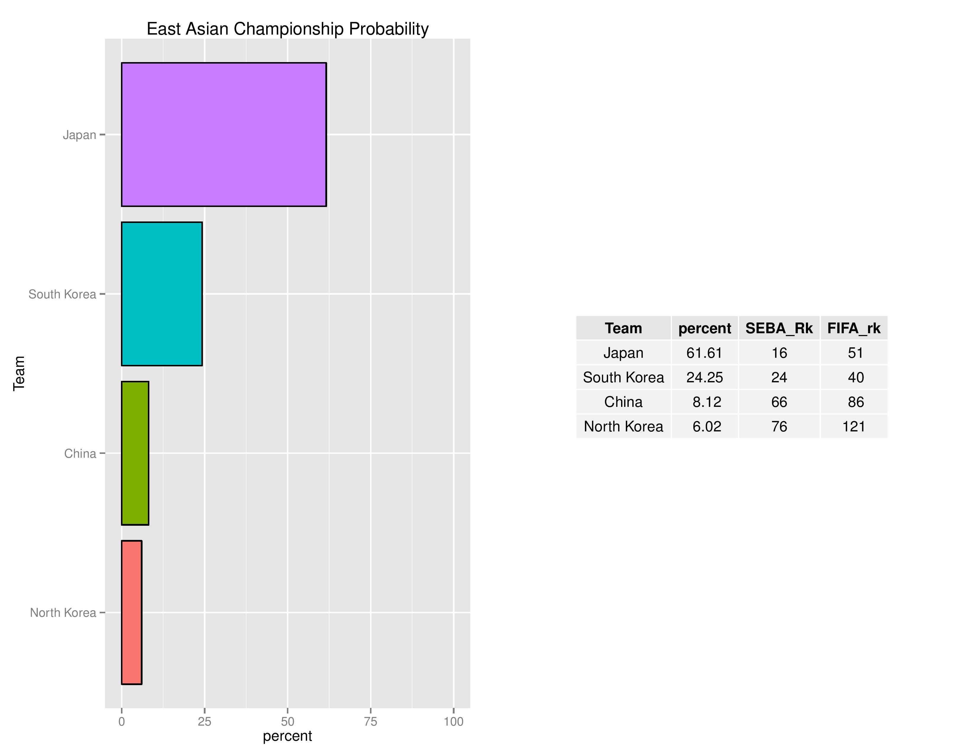 • My final objection comes with home field advantage. FIFA behaves as if this advantage does not exist for their rankings. I think that;s silly given how prevalent it is in all aspects of sports. The SEBA model takes home field advantage very seriously.