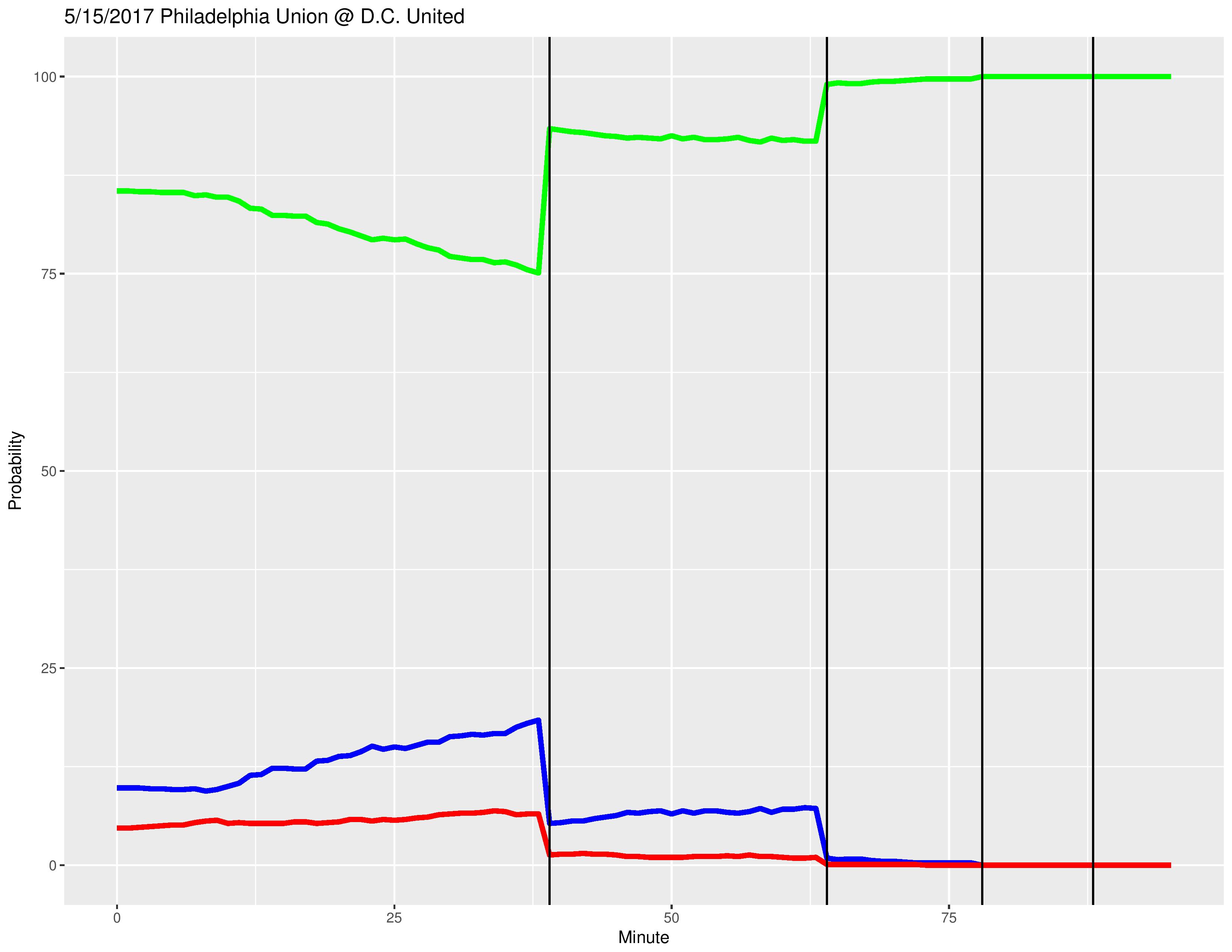 This is currently set up in a very different fashion than it will be, using a number of team stats, but currently assuming that all team stats were performed at the same rate throughout the match. For example, if a match had 7 corner kicks in it, the model would be unaware as to when they happened and therefore assume that 7/90 corner kicks happened per minute. Likewise, a red card would be assumed to happen 1/90 per minute even if it actually occurs late in the game.