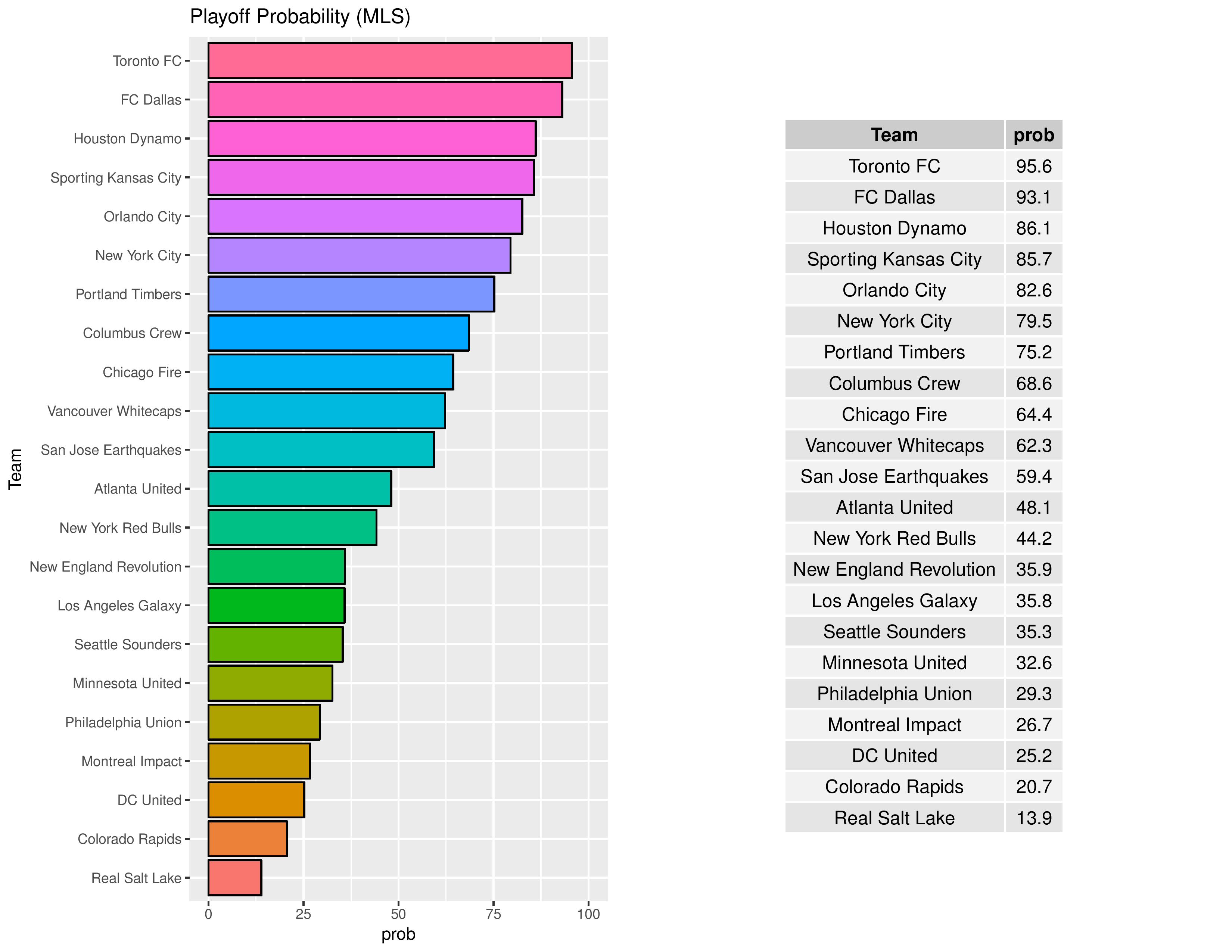 The “Power Rankings” we concoct are the “strength” of the team according to its competitive expectations. They are computed by forecasting the expected points (3 x win probability + 1 x draw probability) against every MLS team, both home and away, and taking the average per team.