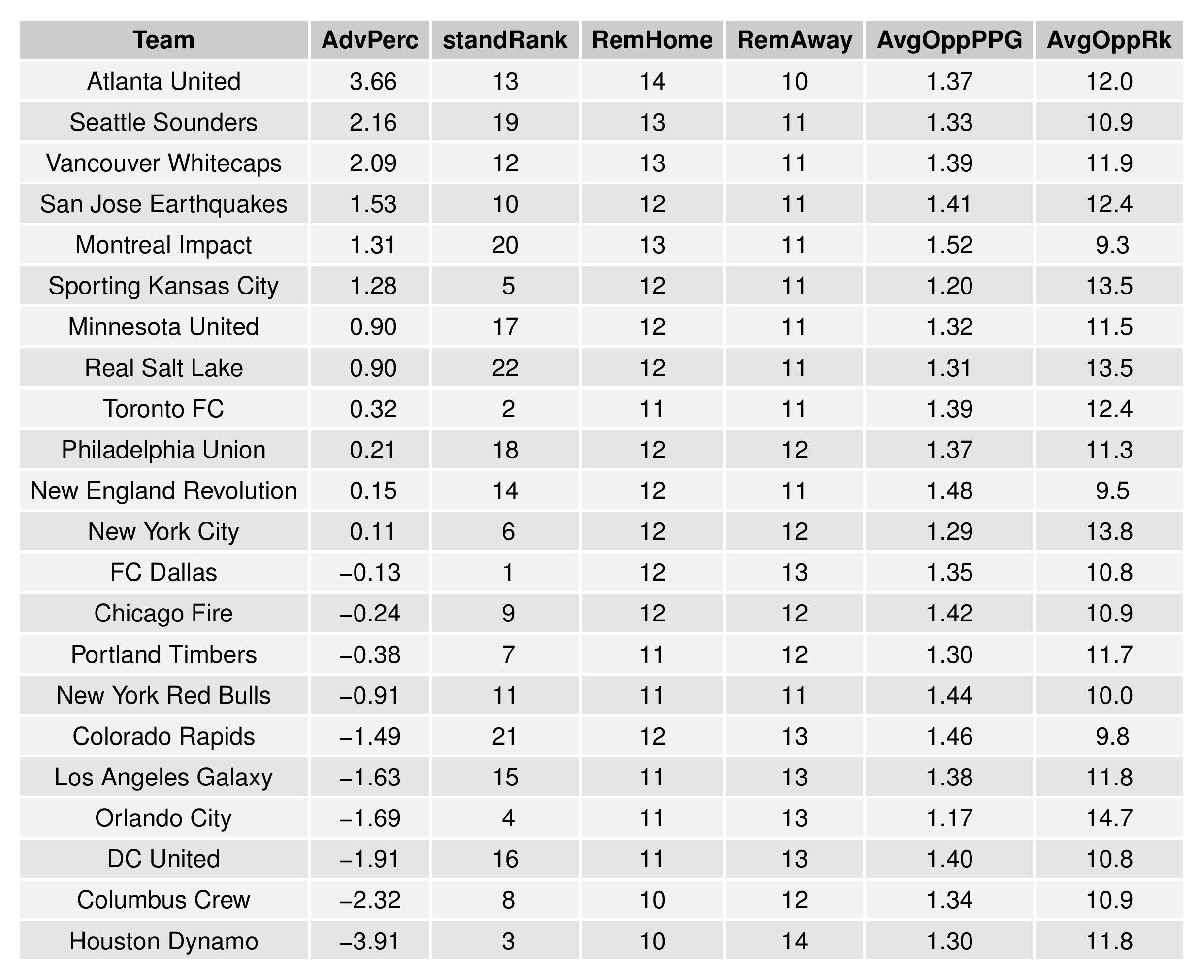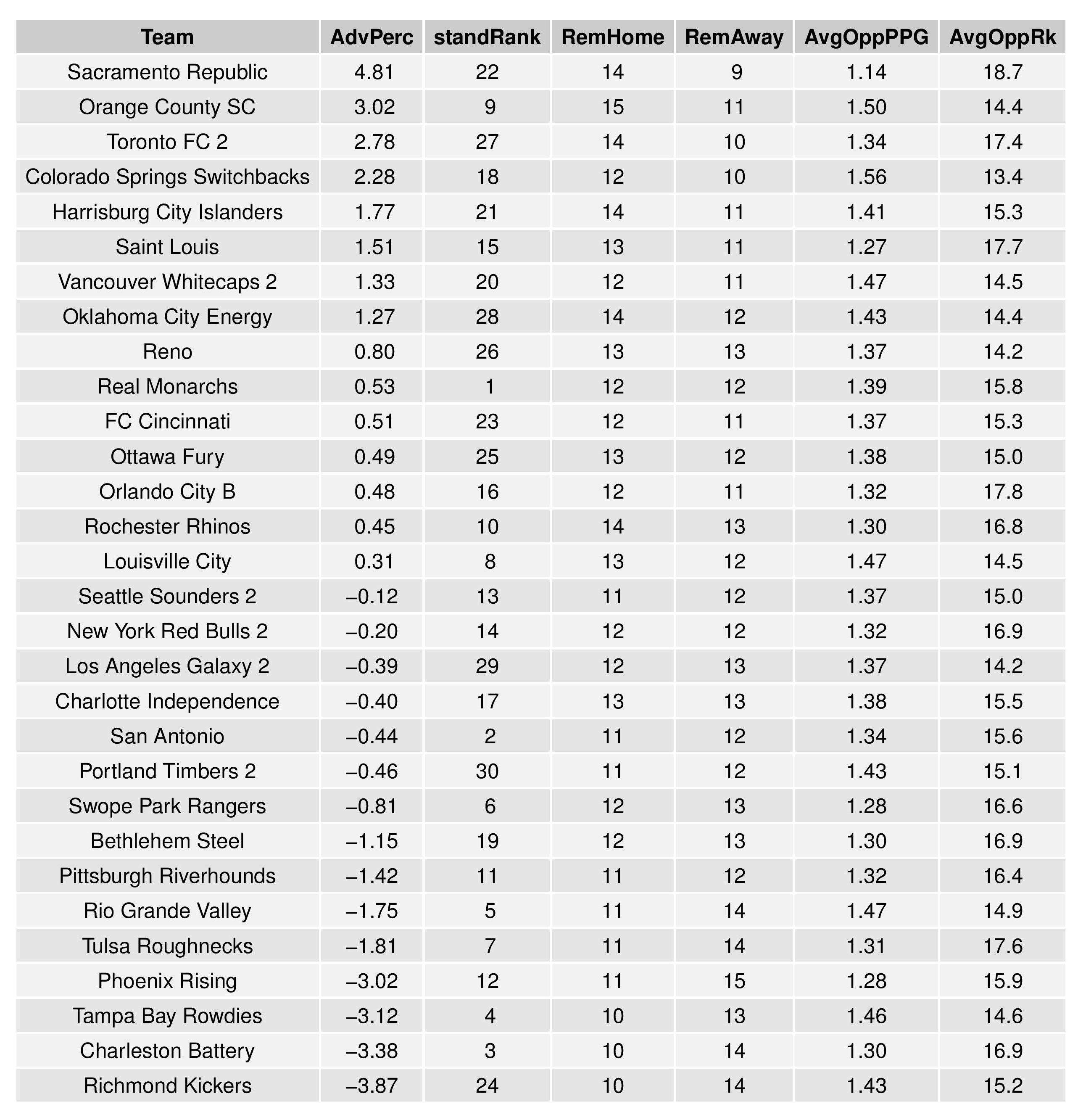 Accompanying the advantage percentage in the following table is their current standings rank (right now ties are not properly calculated beyond pts/gd/gf; I may fix that, but maybe not for a while), the remaining home matches, the remaining away matches, the current average points-per-game of future opponents (results-based, not model-based), and the average power ranking of future opponents according to SEBA.