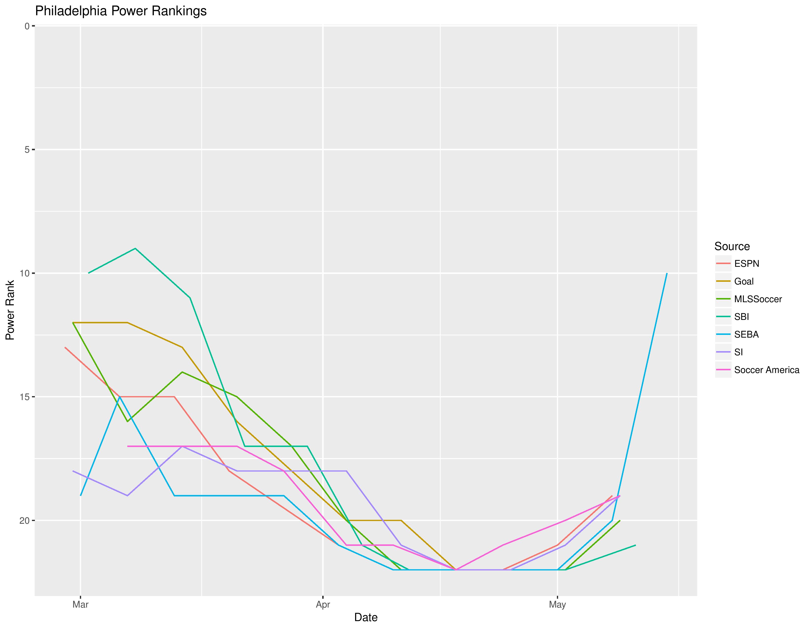 SEBA has the Union improving to 10th from 20th. ESPN moves Philadelphia up to 18th from 19th.