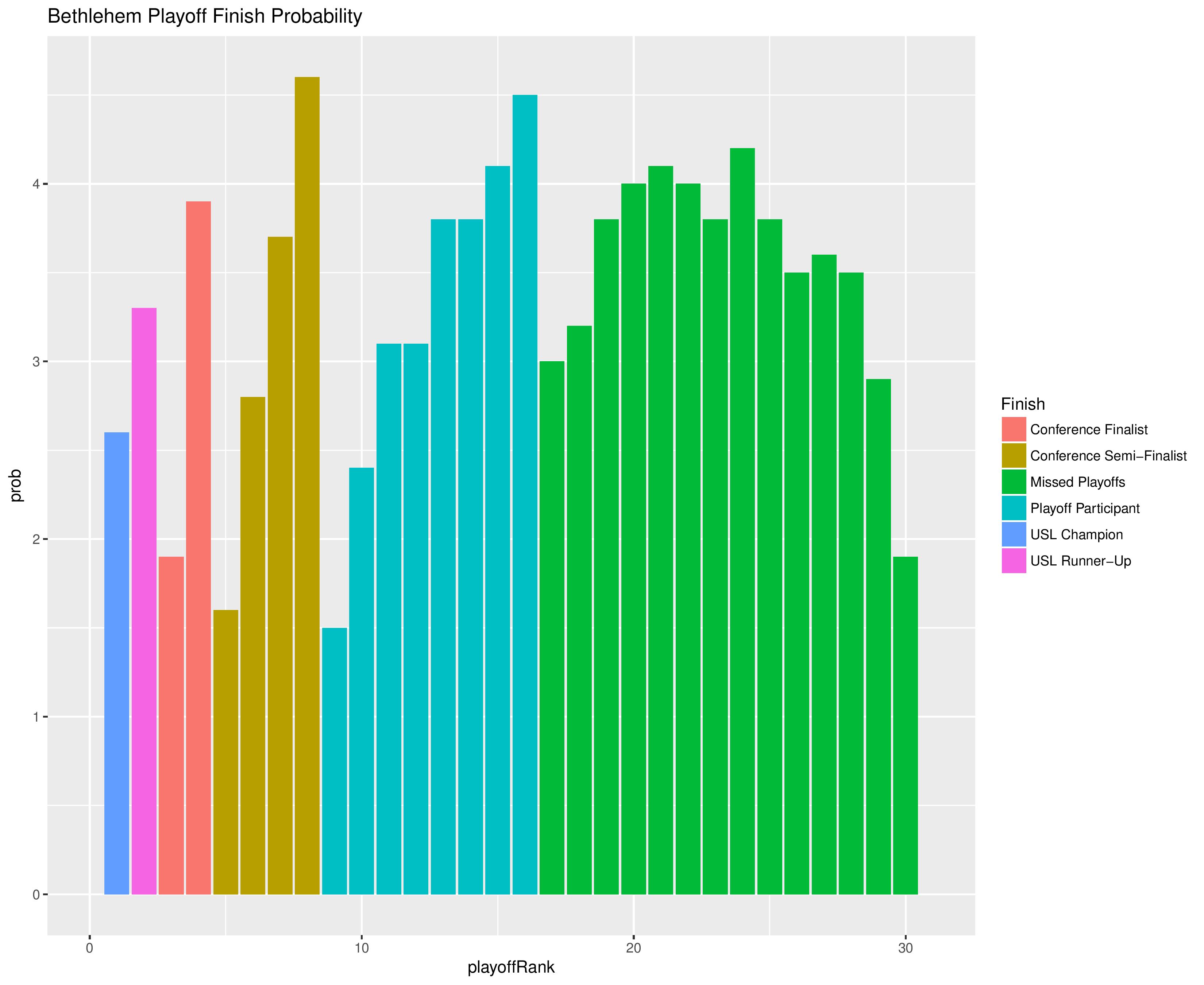 Bethlehem’s odds at becoming the USL Champion increased from 1.3% to 2.6% while Harrisburg City’s increased from 2.0% to 2.1%: