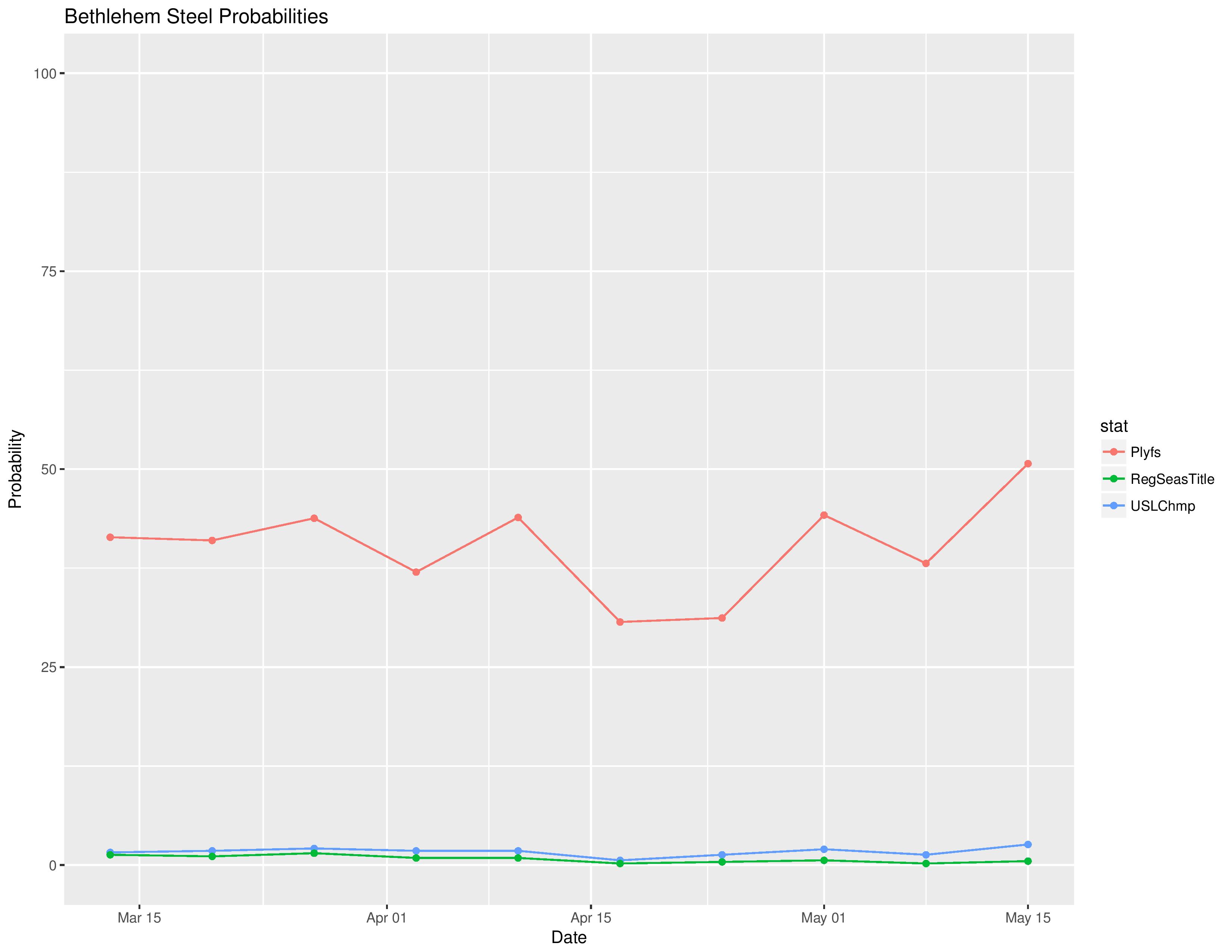 Bethlehem’s chances at winning the Regular Season Title increased to 0.5% from 0.2% while Harrisburg City decreased from 0.5% to 0.4%.
