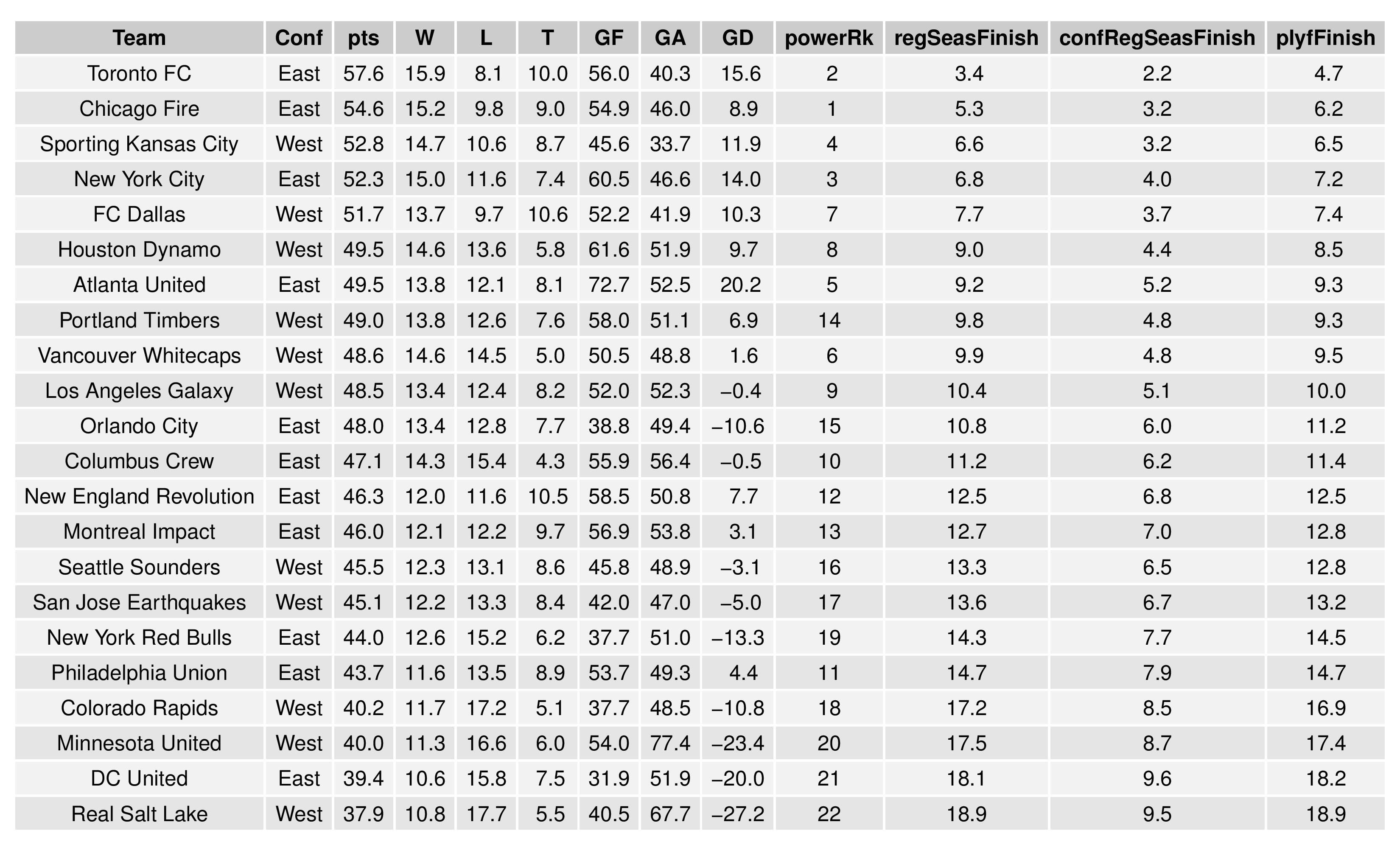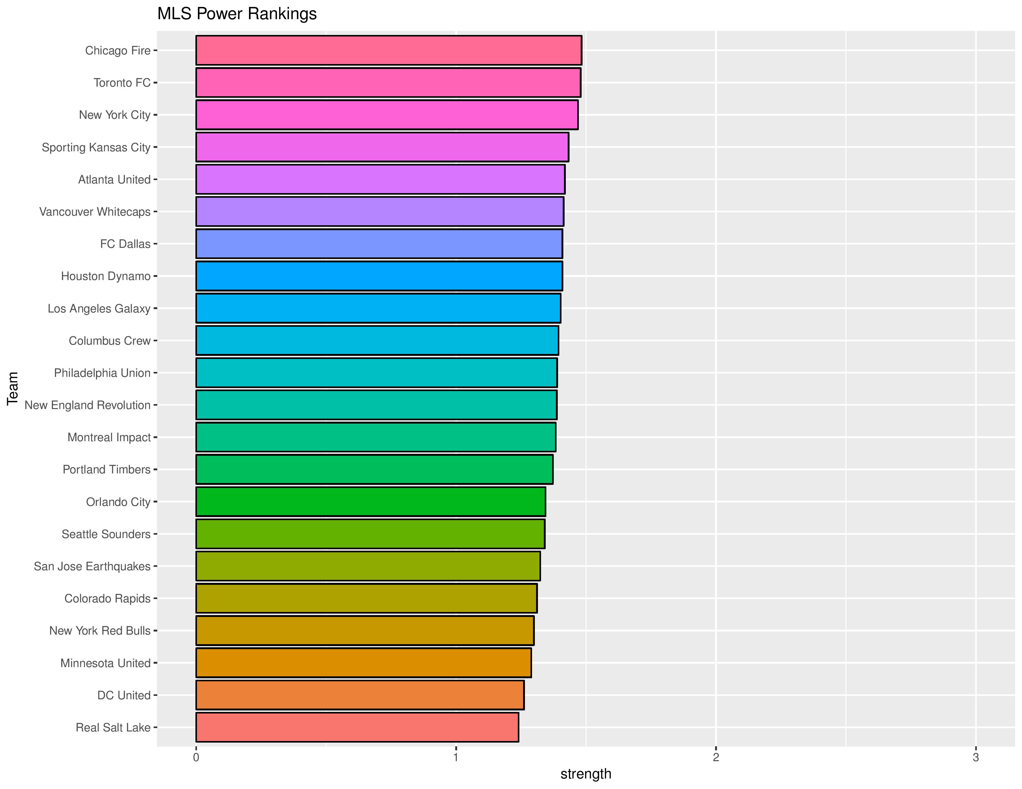 The “Power Rankings” we concoct are the “strength” of the team according to its competitive expectations. They are computed by forecasting the expected points (3 x win probability + 1 x draw probability) against every MLS team, both home and away, and taking the average per team.