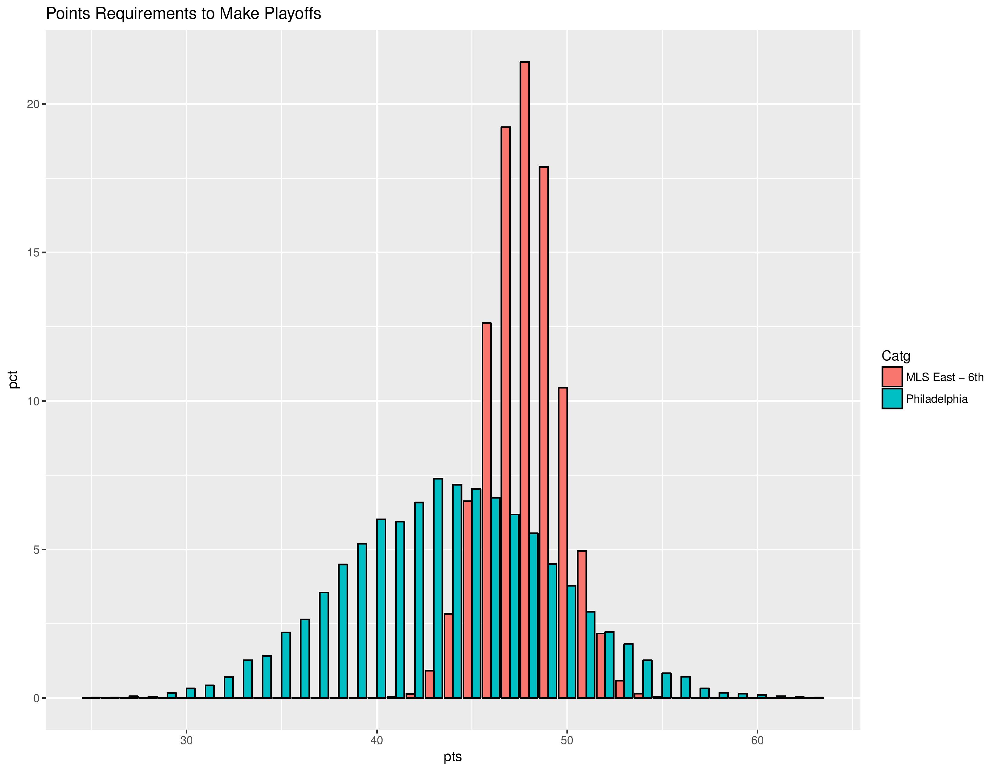 The following shows the simulation distribution for the points earned by the sixth place MLS East club, joined with the simulation distribution of points that Philadelphia is expected to earn.