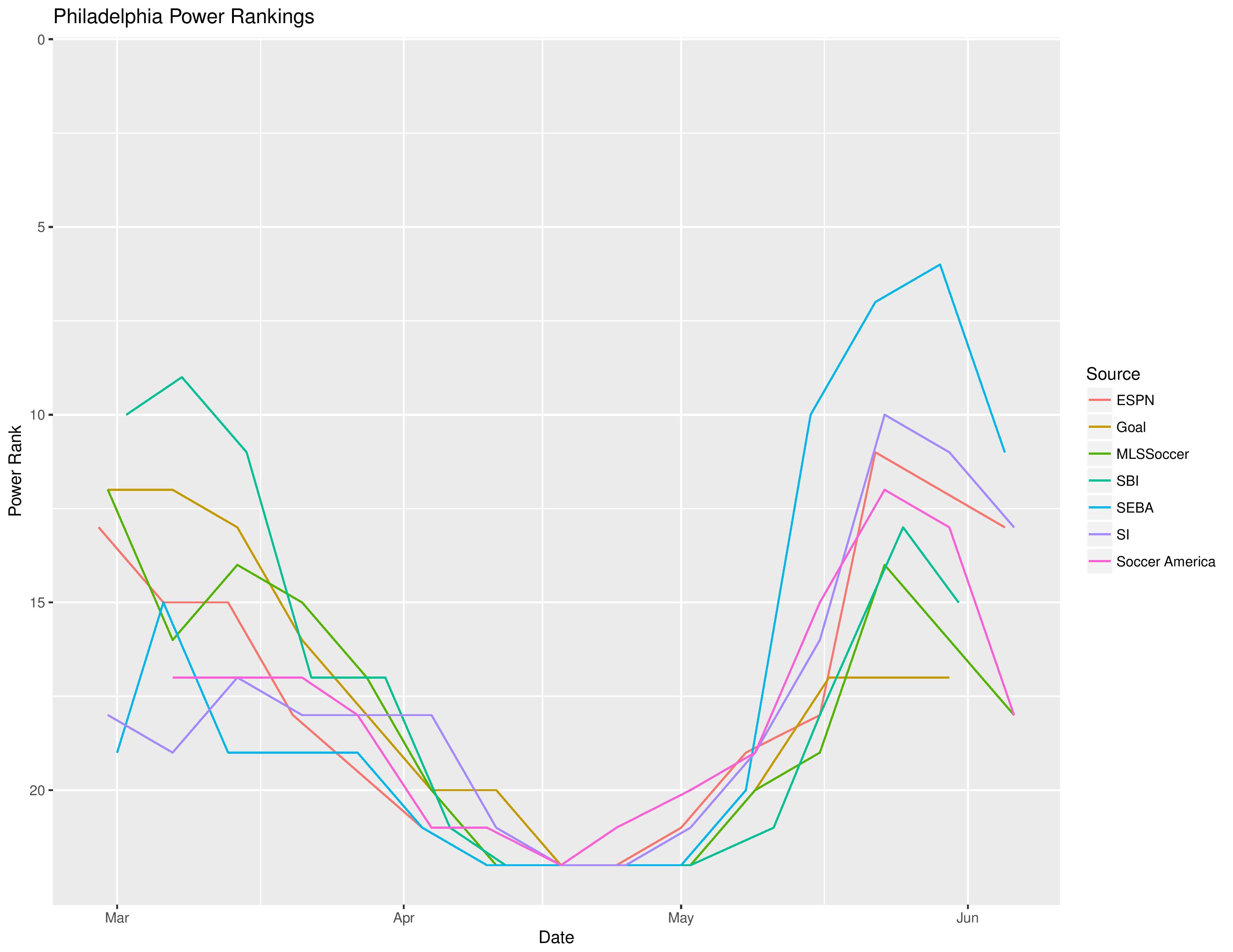 SEBA has the Union declining from 6th to 11th. ESPN has Philadelphia declining from 12th to 13th. Soccer America has the Union declining from 13th to 18th. SI has Philadelphia declining from 11th to 13th. MLSSoccer.com has the Union declining from 16th to 18th.