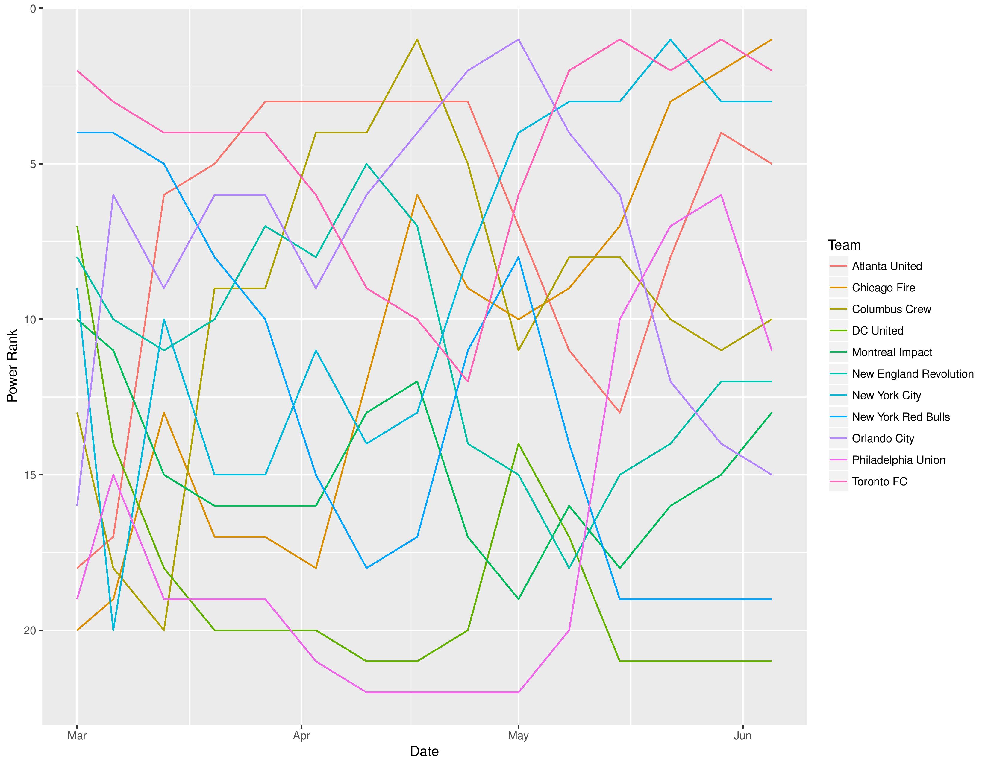 The following shows the evolution of SEBA’s power rankings for the MLS Eastern Conference over time.