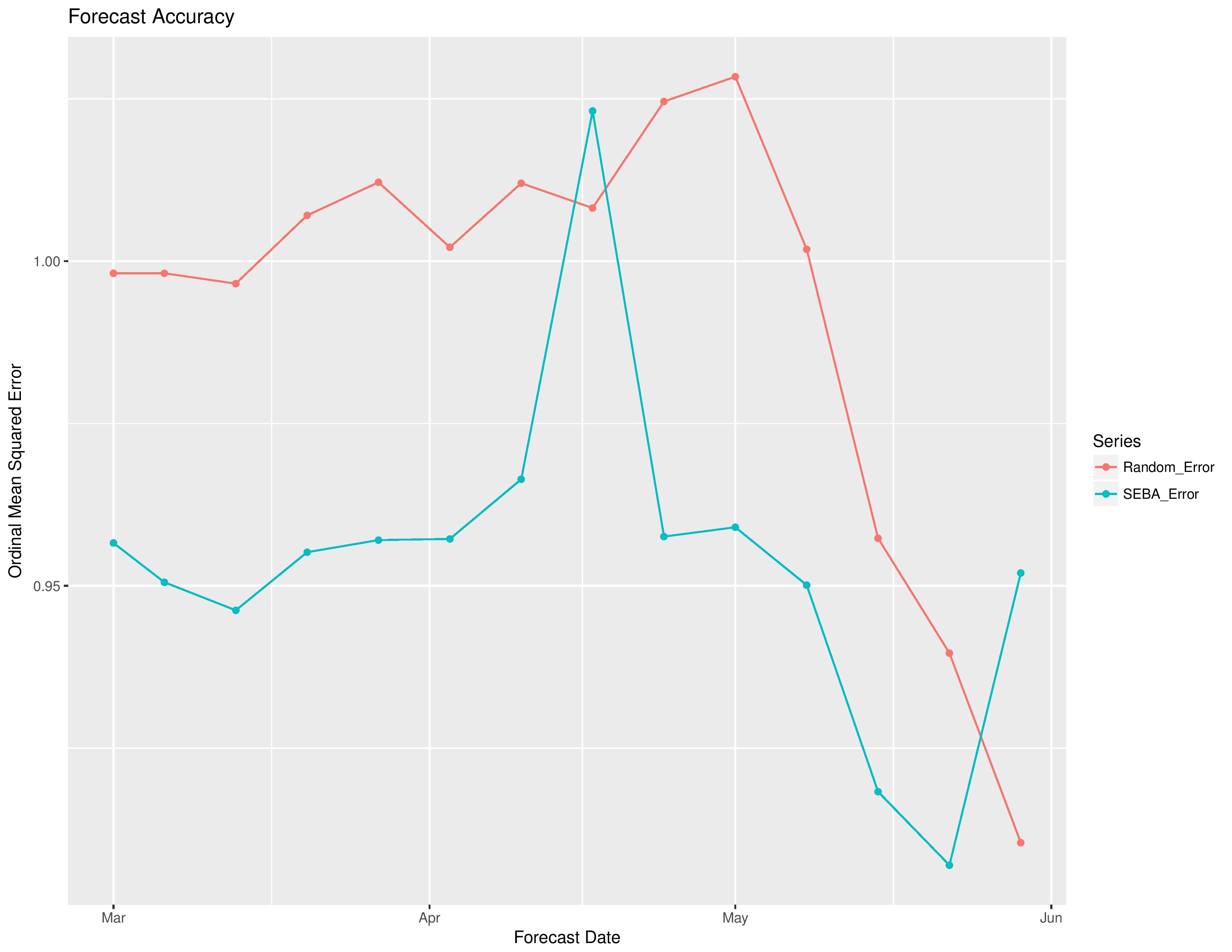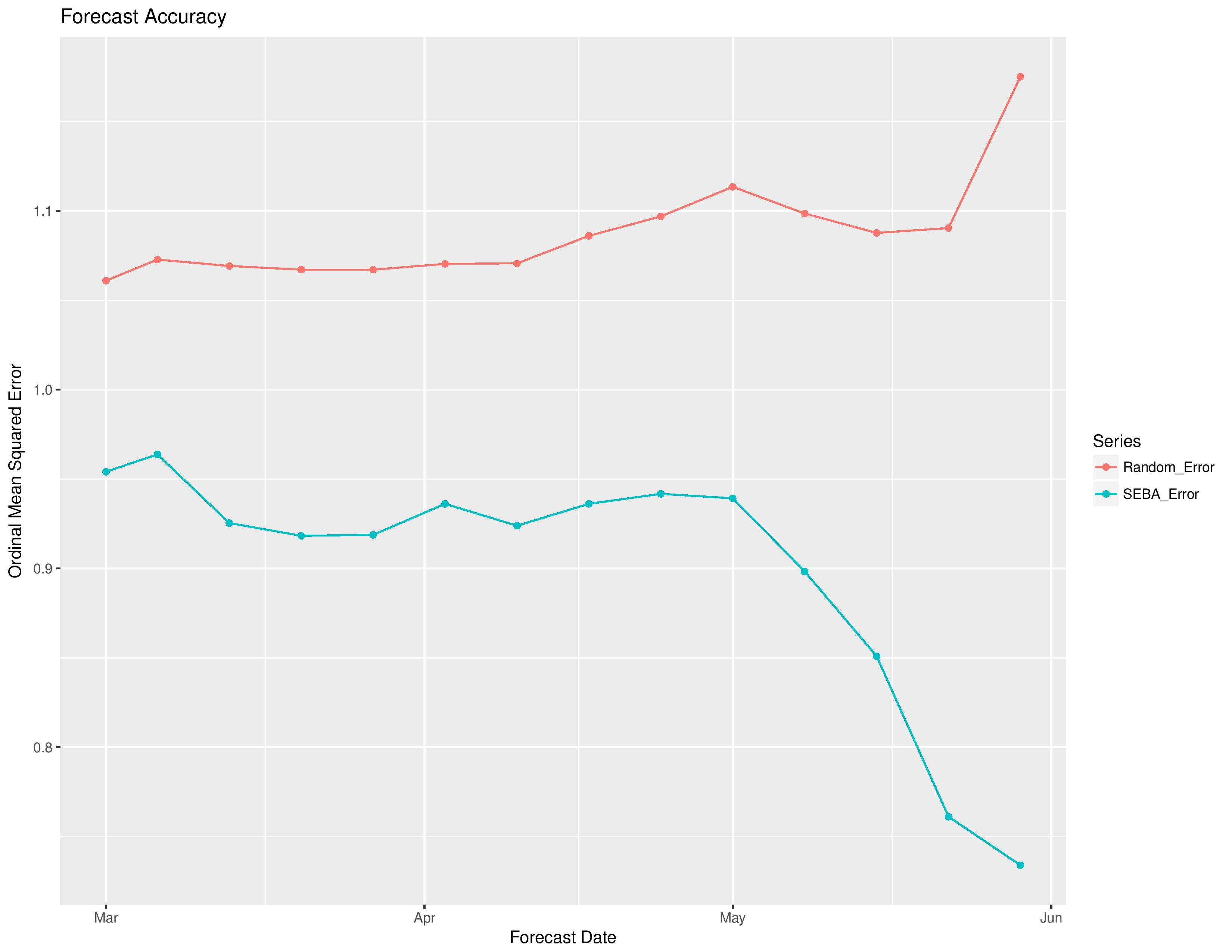 The following shows the degree of error by the model vs the error if the model was purely random without intelligence. The x-axis is based on the date from which the forecast was made (this will update throughout the season as more results are finalized and compared with predictions). The ordinal squared error metric (not a traditional metric) is calculated as: