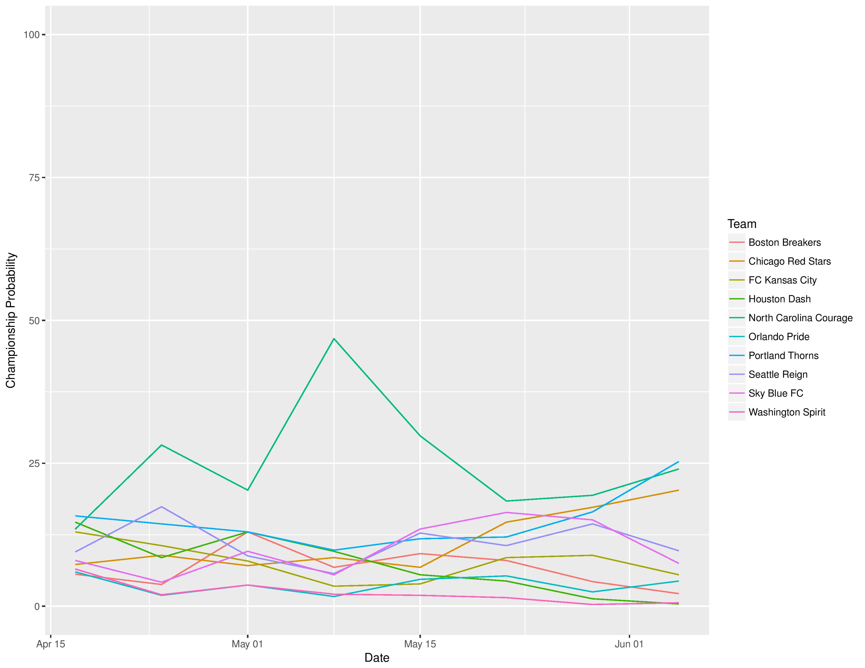 For the following, the green line represents the odds of a win, the blue line the odds of a tie, and the red line the odds of a loss.