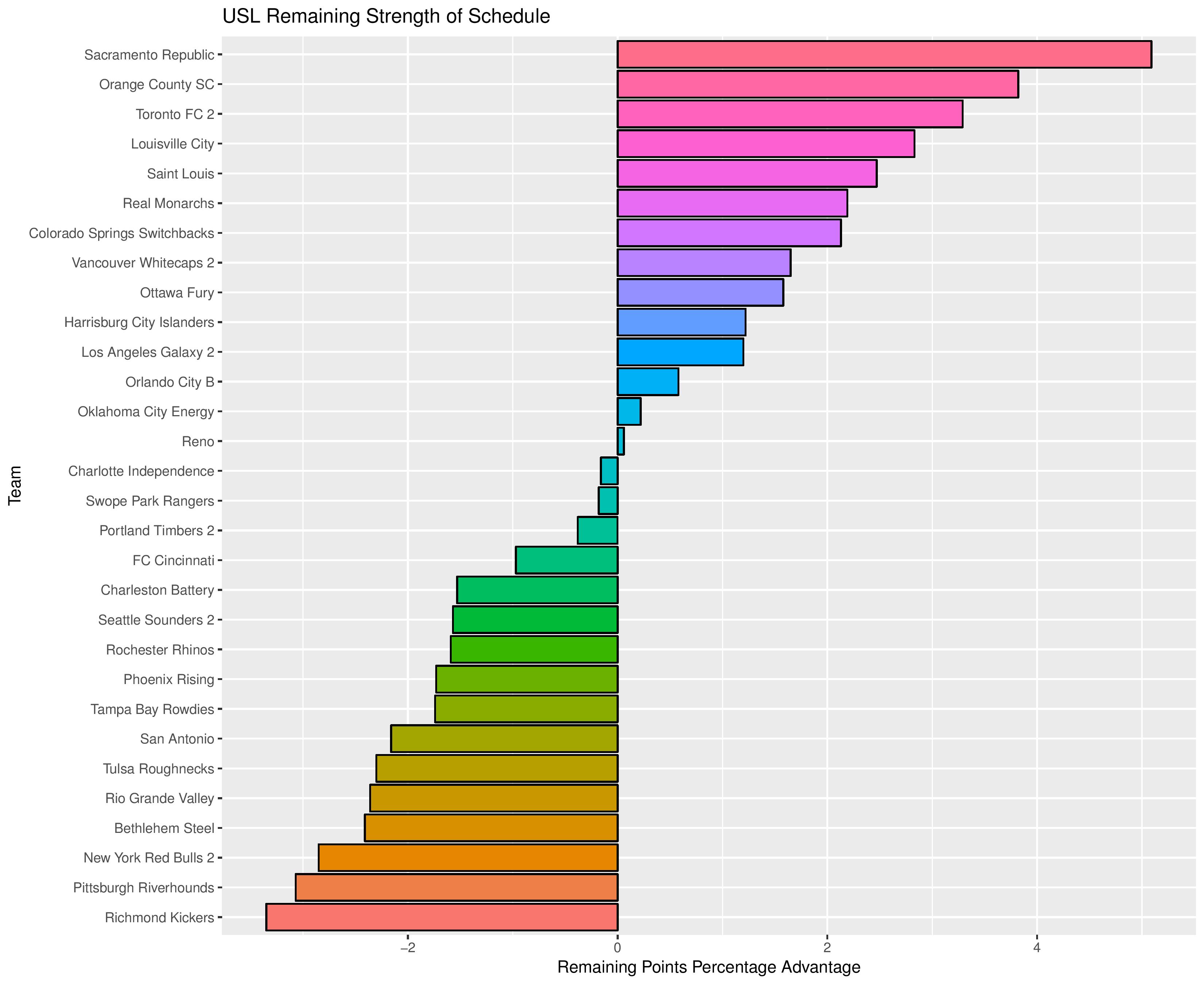 The “Points Percentage Advantage” shown on the X-axis represents the percentage of points expected over the league average schedule. This “points expected” value is generated by simulating how all teams would perform with all remaining schedules (and therefore judges a schedule based upon how all teams would perform in that scenario).