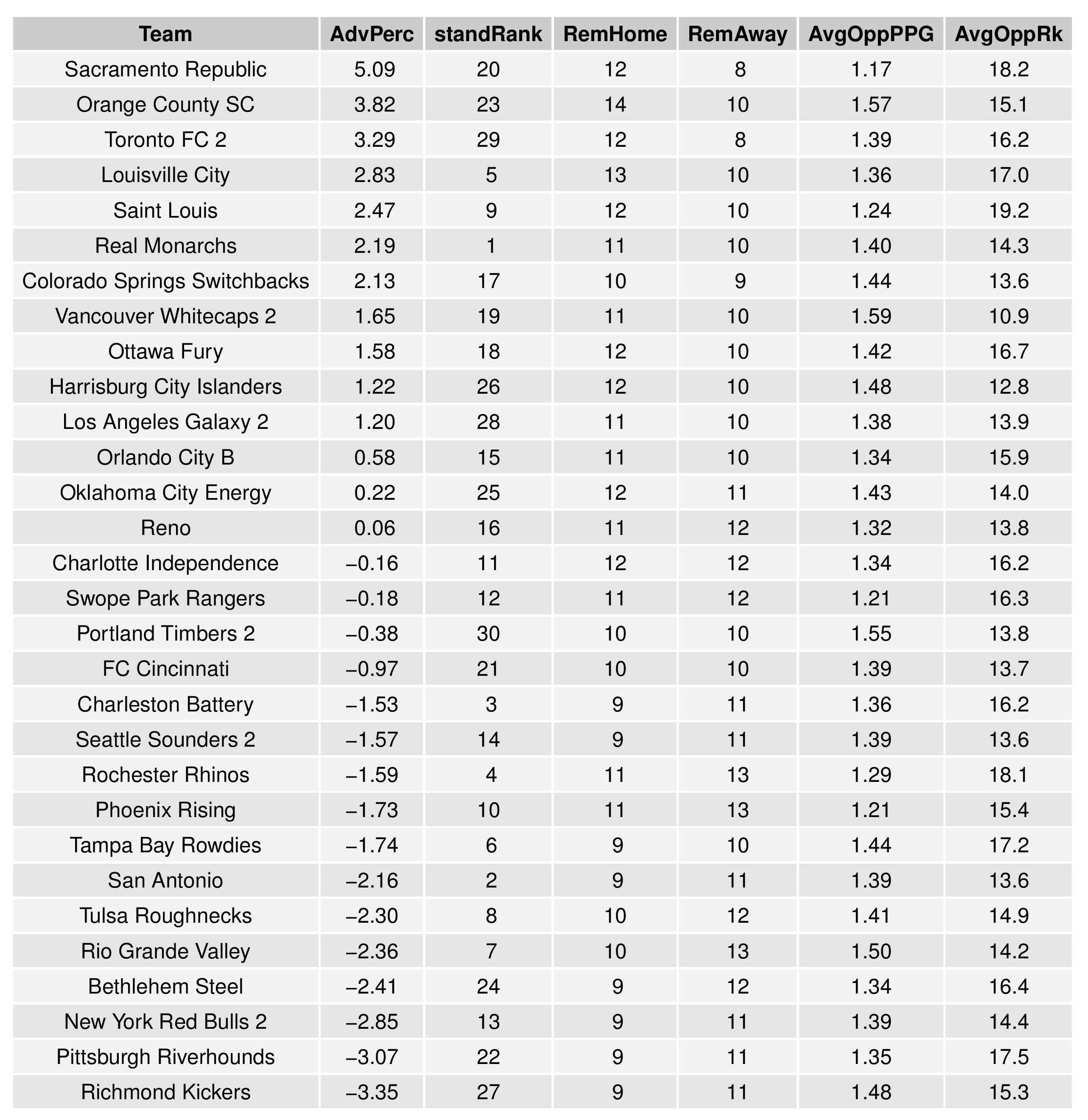 Accompanying the advantage percentage in the following table is their current standings rank (right now ties are not properly calculated beyond pts/gd/gf; I may fix that, but maybe not for a while), the remaining home matches, the remaining away matches, the current average points-per-game of future opponents (results-based, not model-based), and the average power ranking of future opponents according to SEBA.