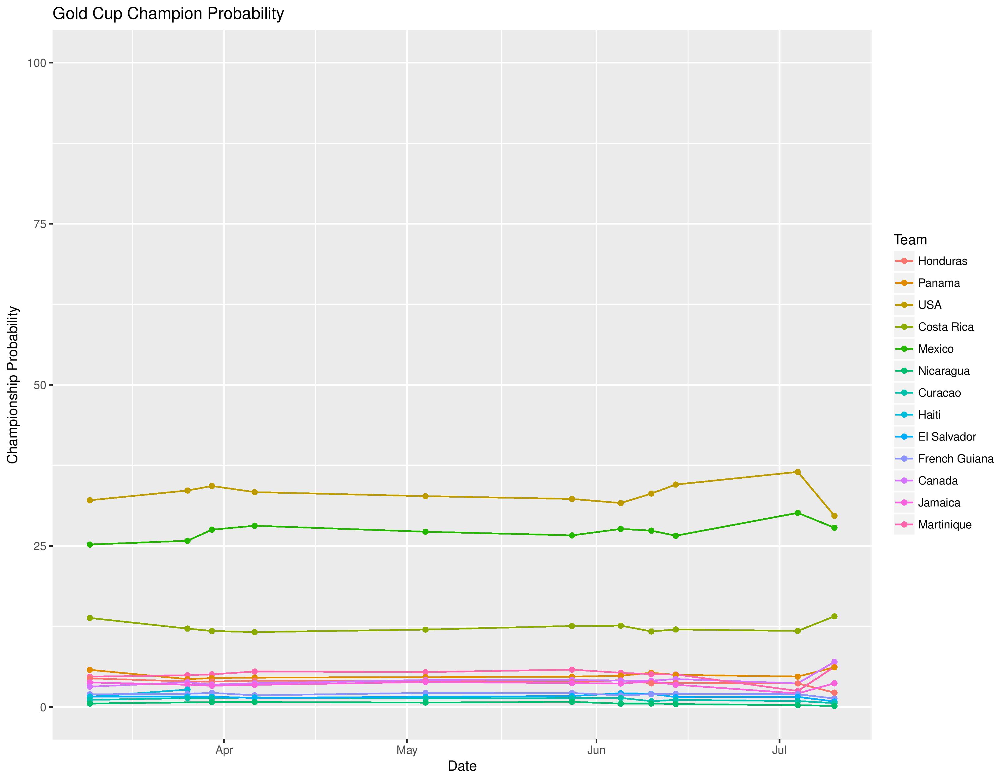 The following shows the Gold Cup champion forecast. The USA’s odds of winning the Gold Cup have decreased from 36.50% to 29.69%.