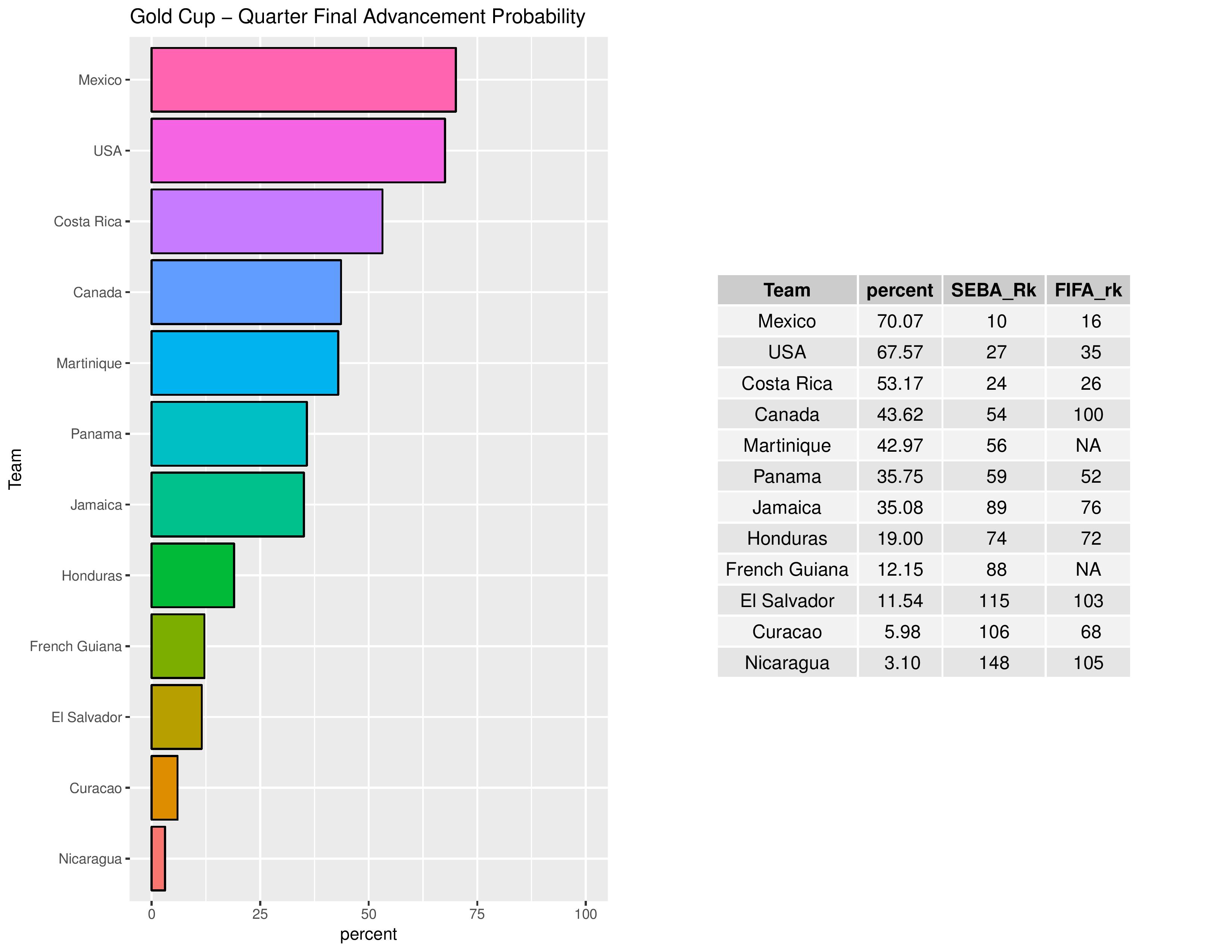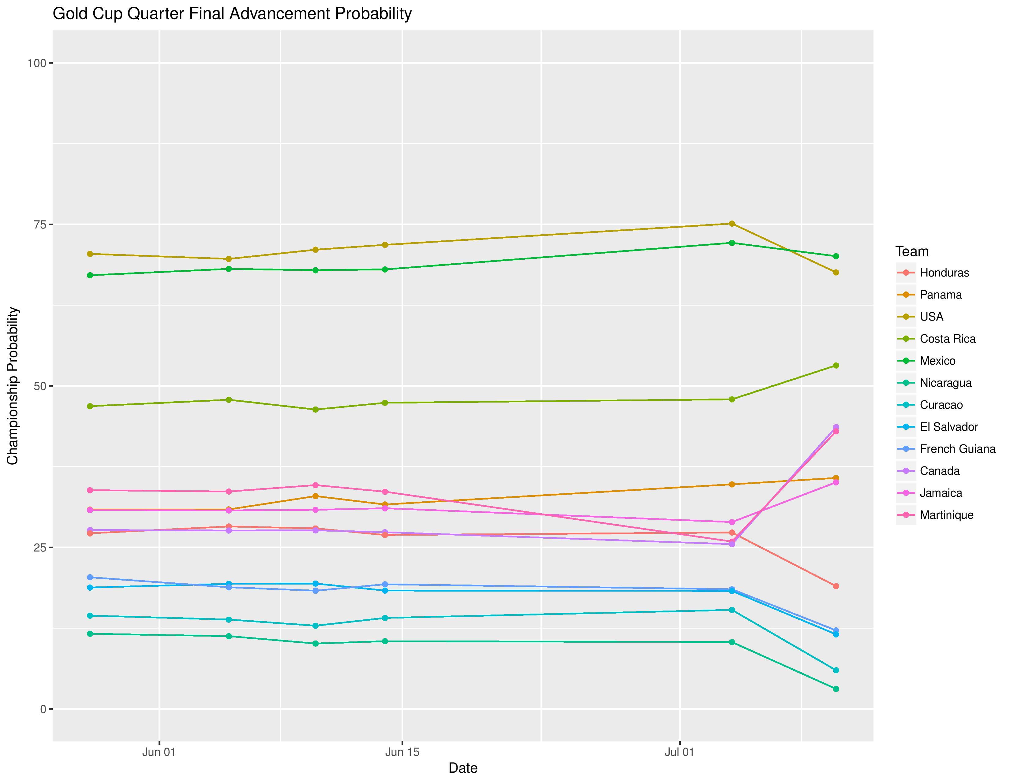 The following shows the probabilities of teams advancing through the group stage of the Gold Cup. The USA’s chances decreased from 98.92% to 96.39% of advancing through the group stage.