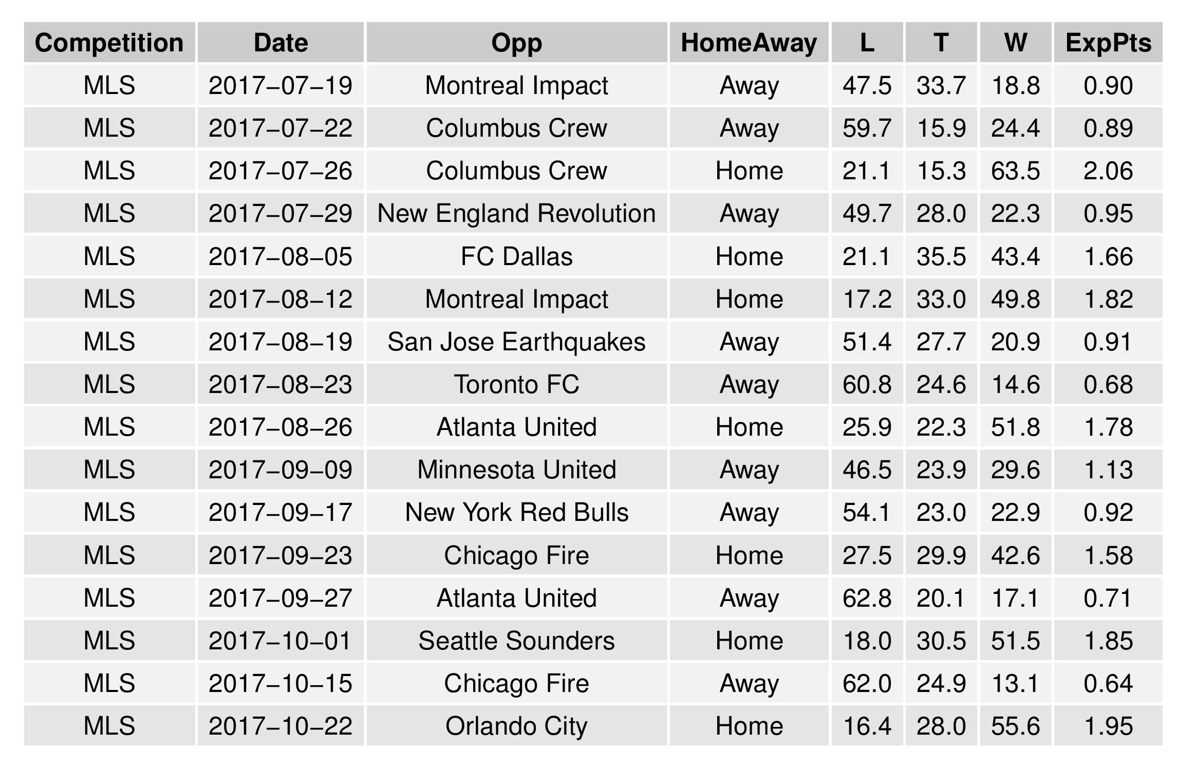 Below are the updated season forecasts using data from games through July 9, 2017 (and does not include the U.S. Open Cup matches played since then).