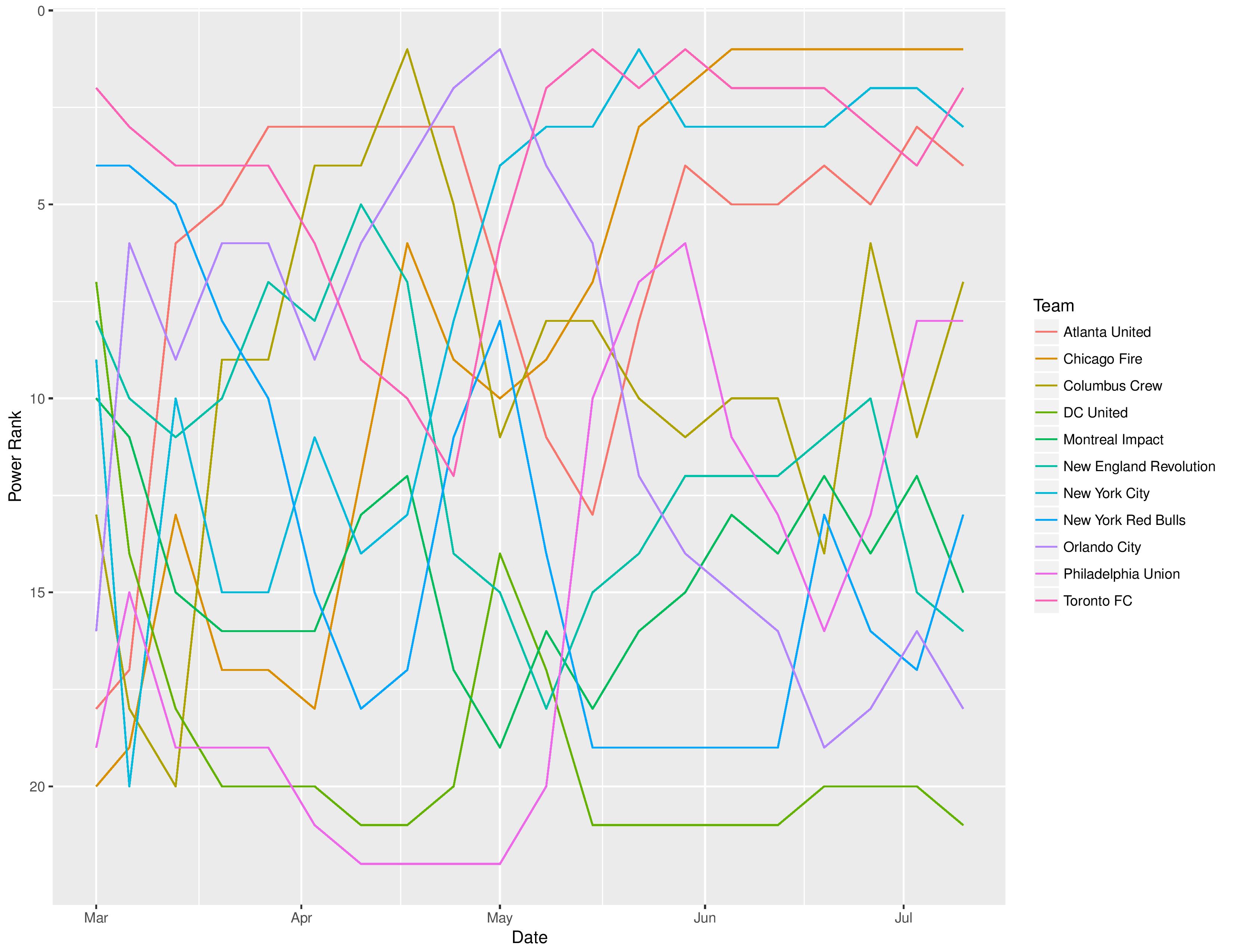 The following shows the evolution of SEBA’s power rankings for the MLS Eastern Conference over time: