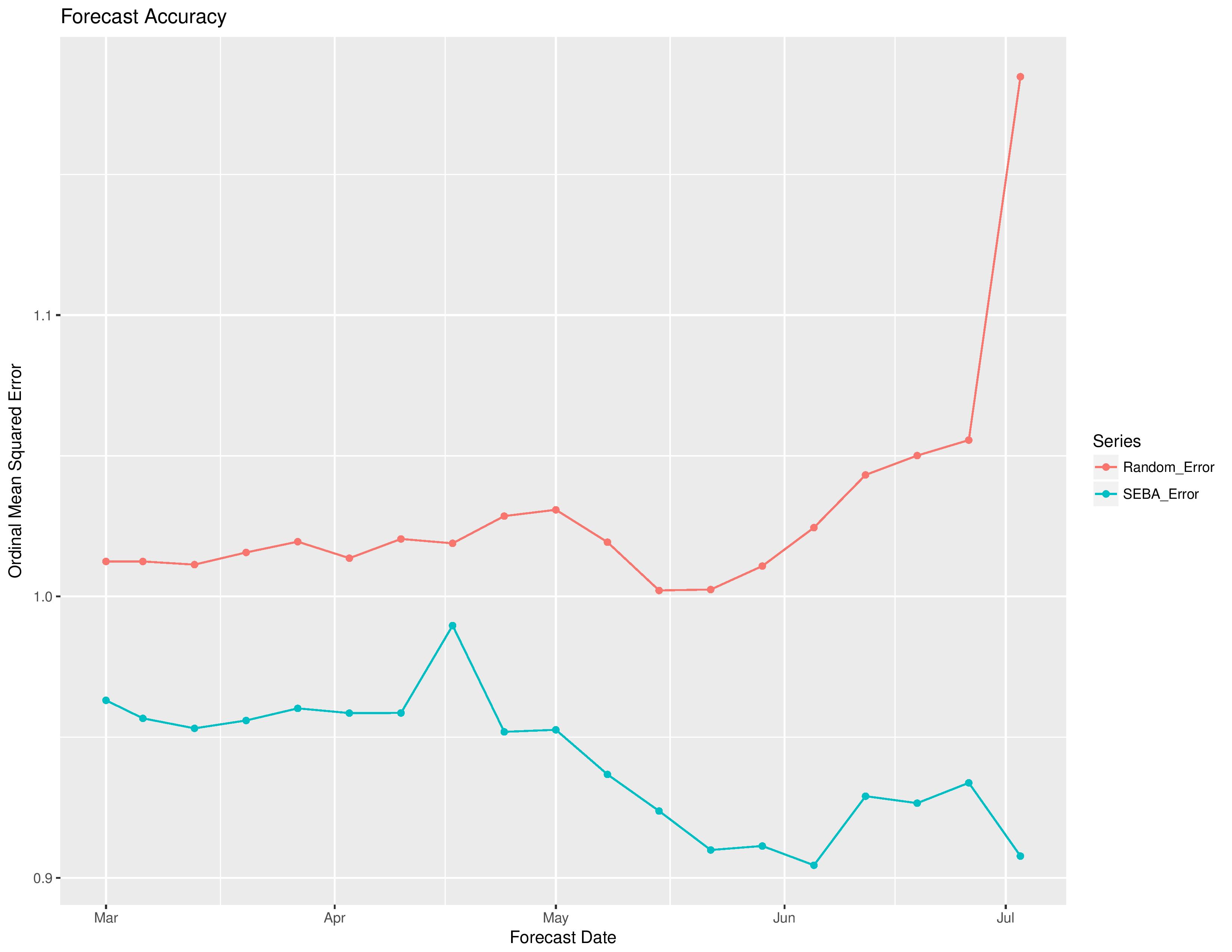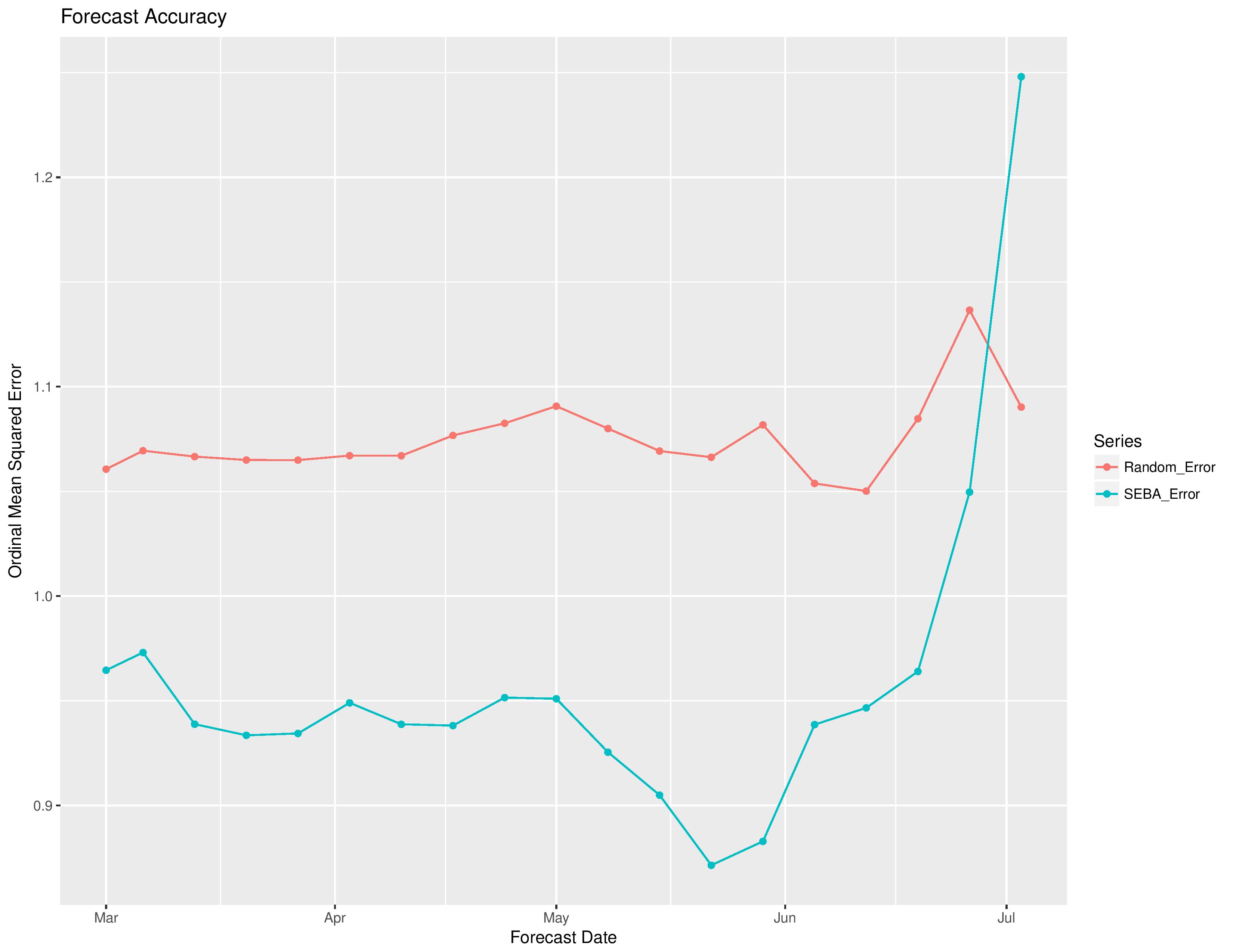 The following shows the degree of error by the model vs the error if the model was purely random without intelligence. The x-axis is based on the date from which the forecast was made (this will update throughout the season as more results are finalized and compared with predictions). The ordinal squared error metric (not a traditional metric) is calculated as: