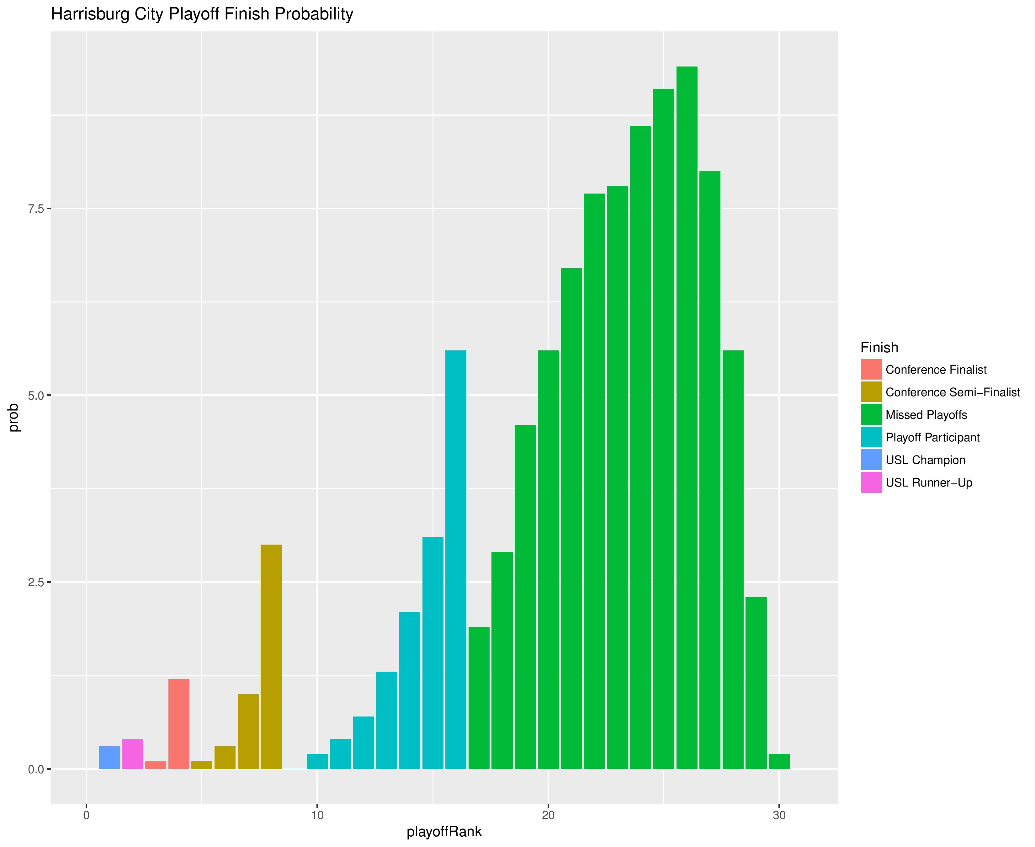 Bethlehem’s playoff odds have increased from 82.6% to 91.1% and Harrisburg City’s odds of making the playoffs have decreased from 24.1% to 19.8%.