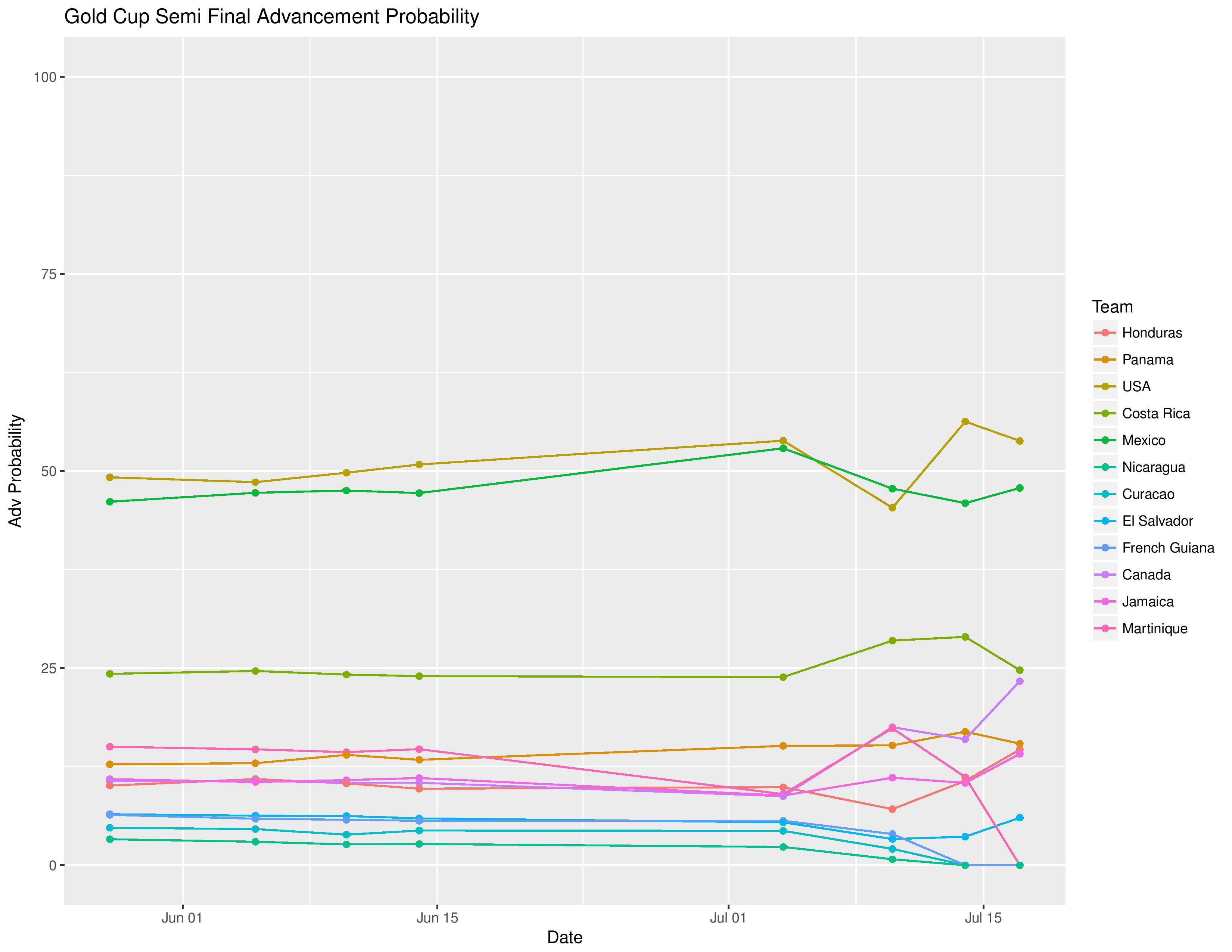 The following shows the Gold Cup champion forecast. The USA’s odds of winning the Gold Cup have increased from 29.69% to 34.17%.