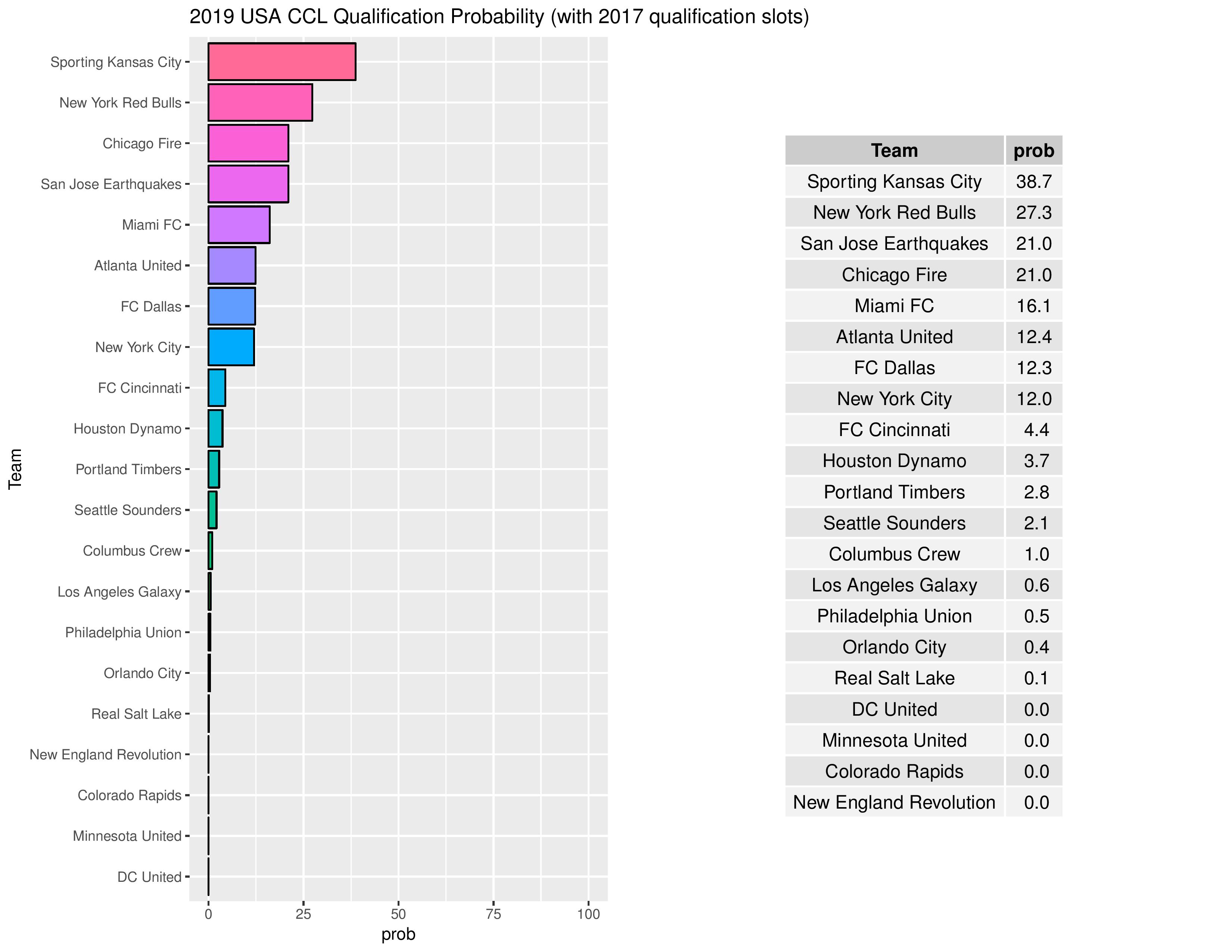 Philadelphia’s chances for qualifying in 2017 for the 2019 edition of the CONCACAF Champions League remain at 0.5%.