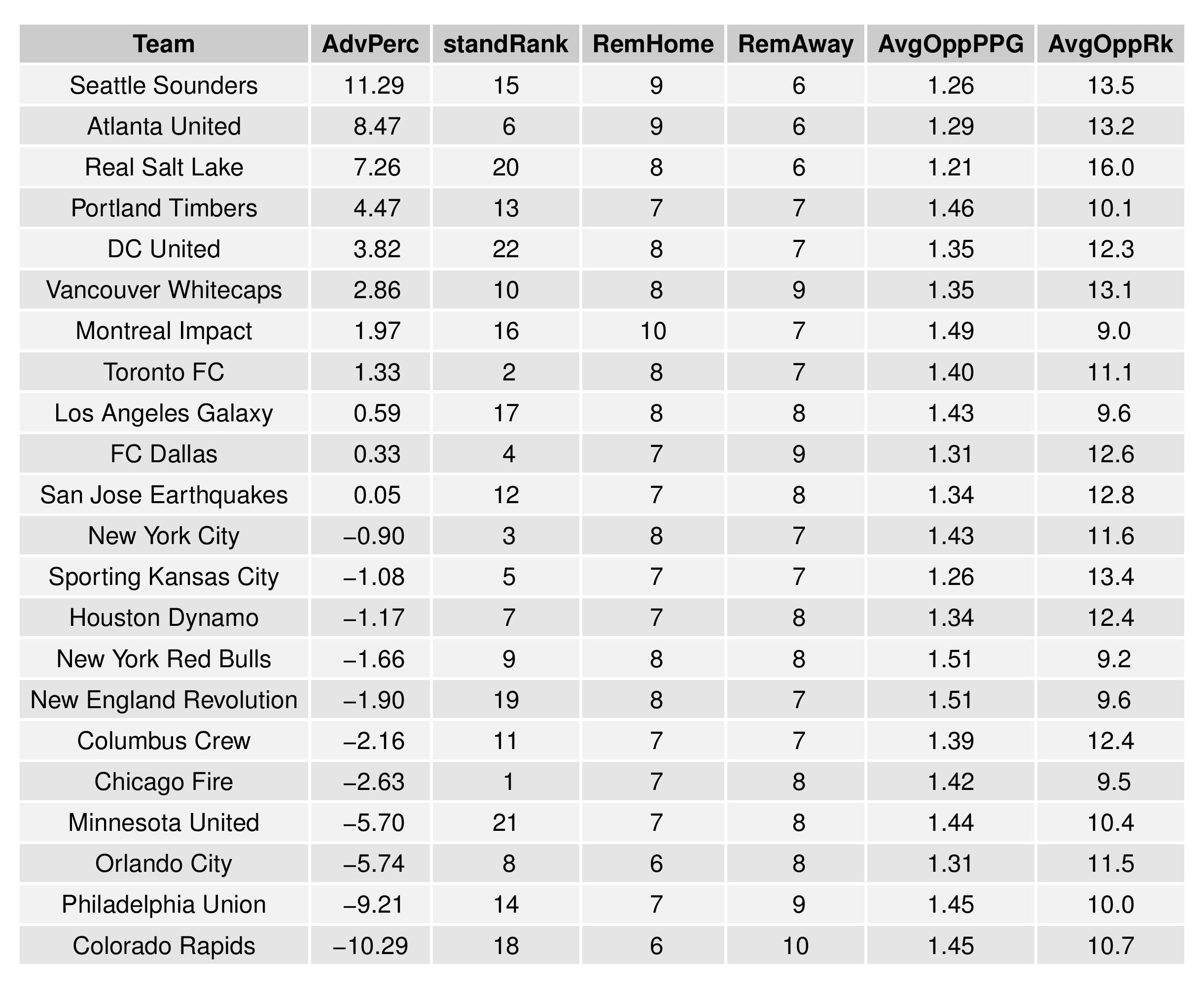Despite other reports suggesting that the Union have the hardest schedule, this models says that Colorado has a harder remaining schedule due to their four extra away matches than home matches.