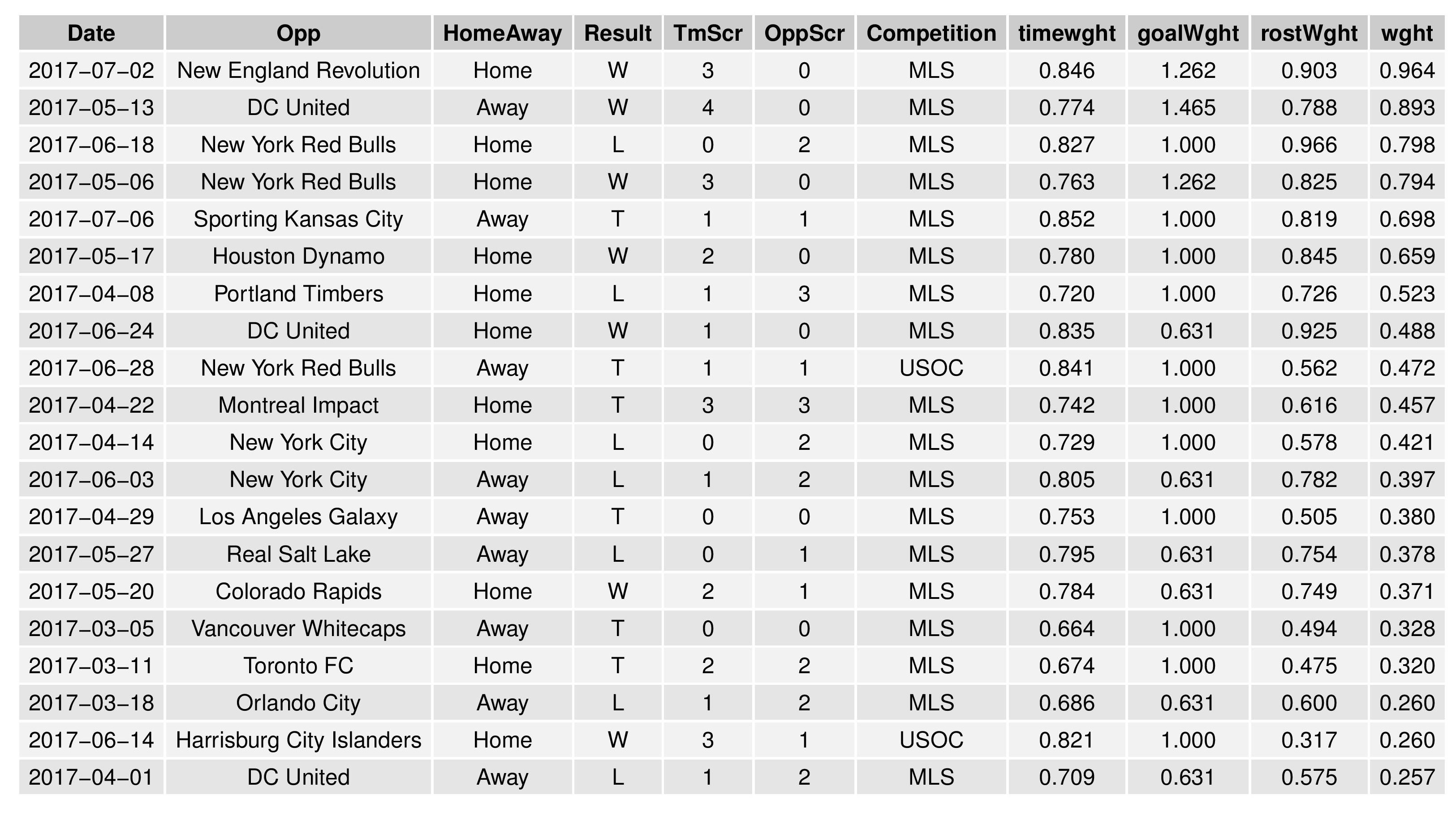 ‘wght’ is the actual weight value used in the model, which is a combination of the ‘timewght’ (how long ago the match occurred), ‘goalWght’ (how much luck could have influenced the match result, as indicated by the goal differential), and ‘rostWght’ (how similar the roster deployments for both teams were compared with current trends).