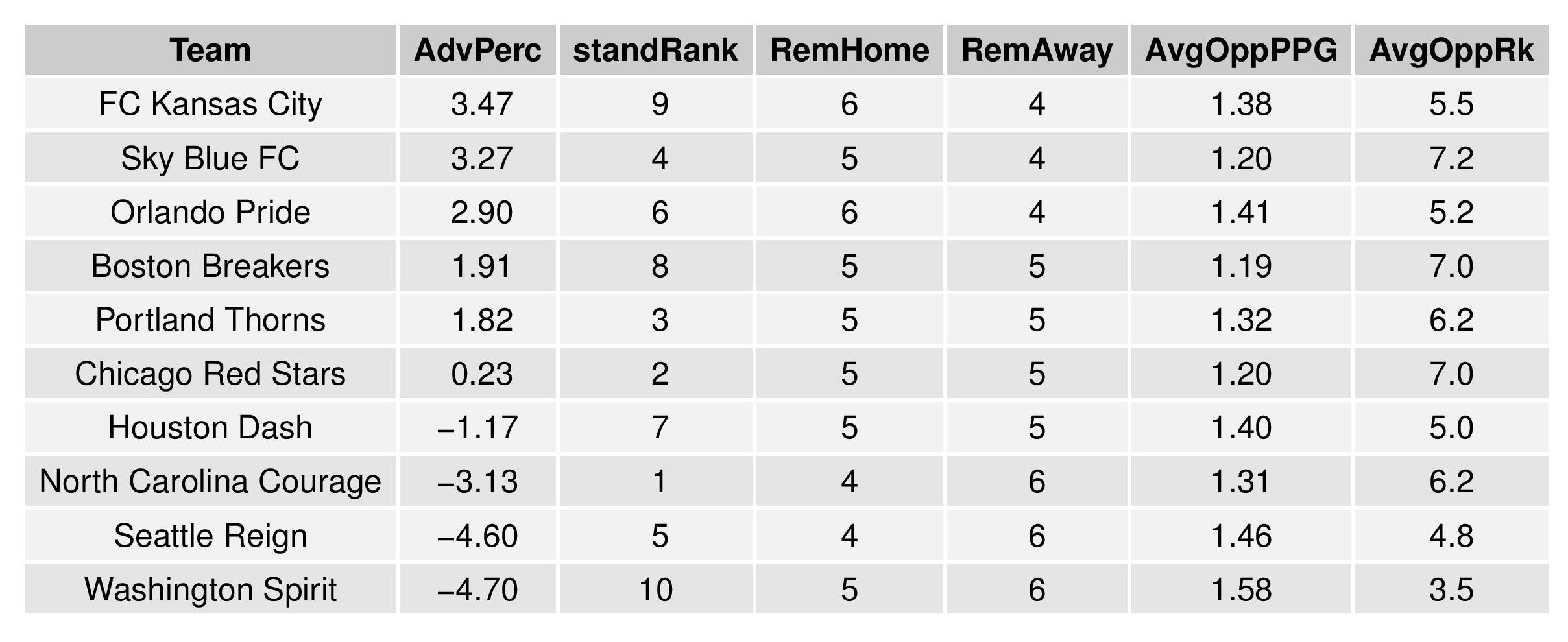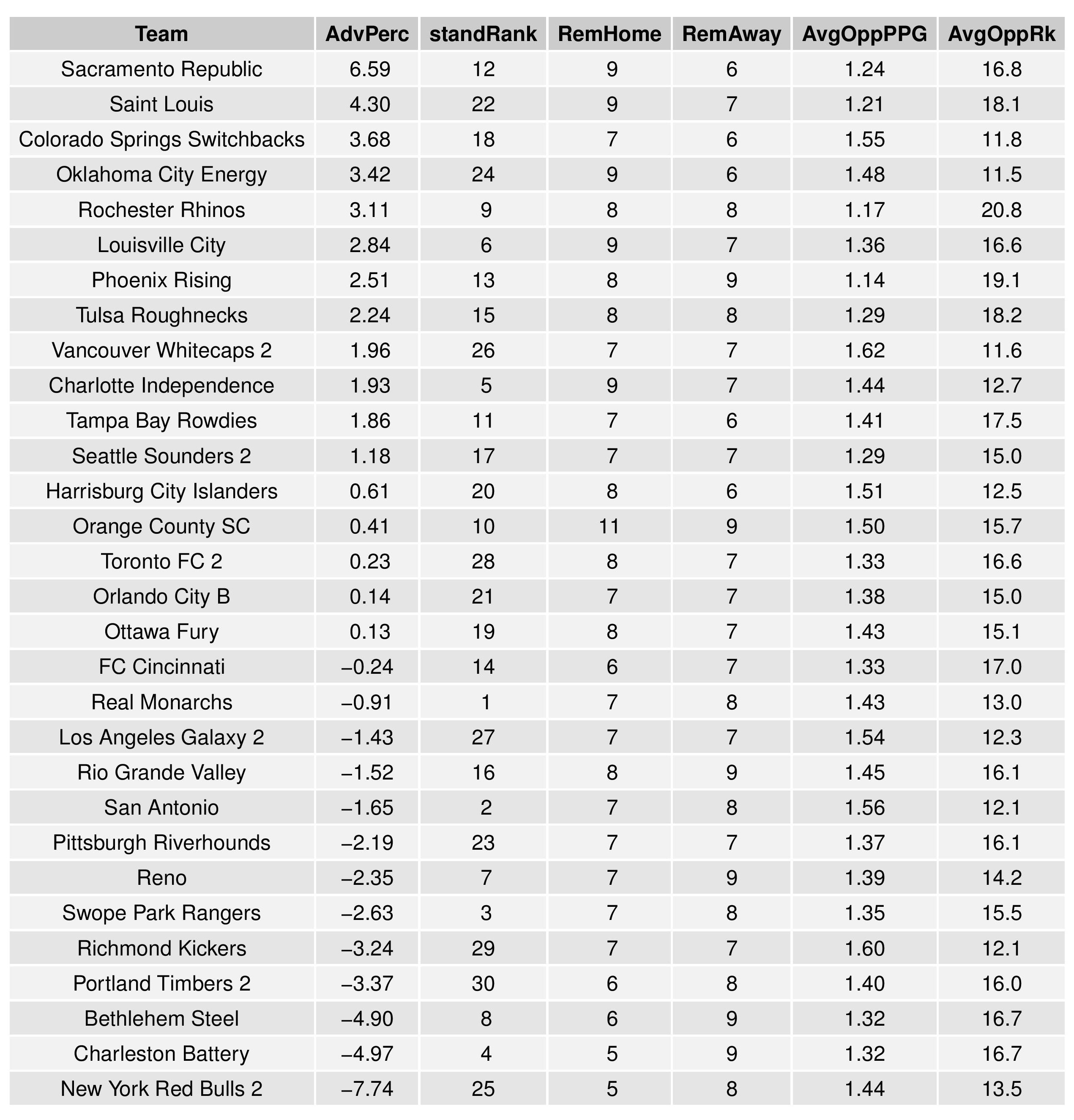 Accompanying the advantage percentage in the following table is their current standings rank (right now ties are not properly calculated beyond pts/gd/gf; I may fix that, but maybe not for a while), the remaining home matches, the remaining away matches, the current average points-per-game of future opponents (results-based, not model-based), and the average power ranking of future opponents according to SEBA.