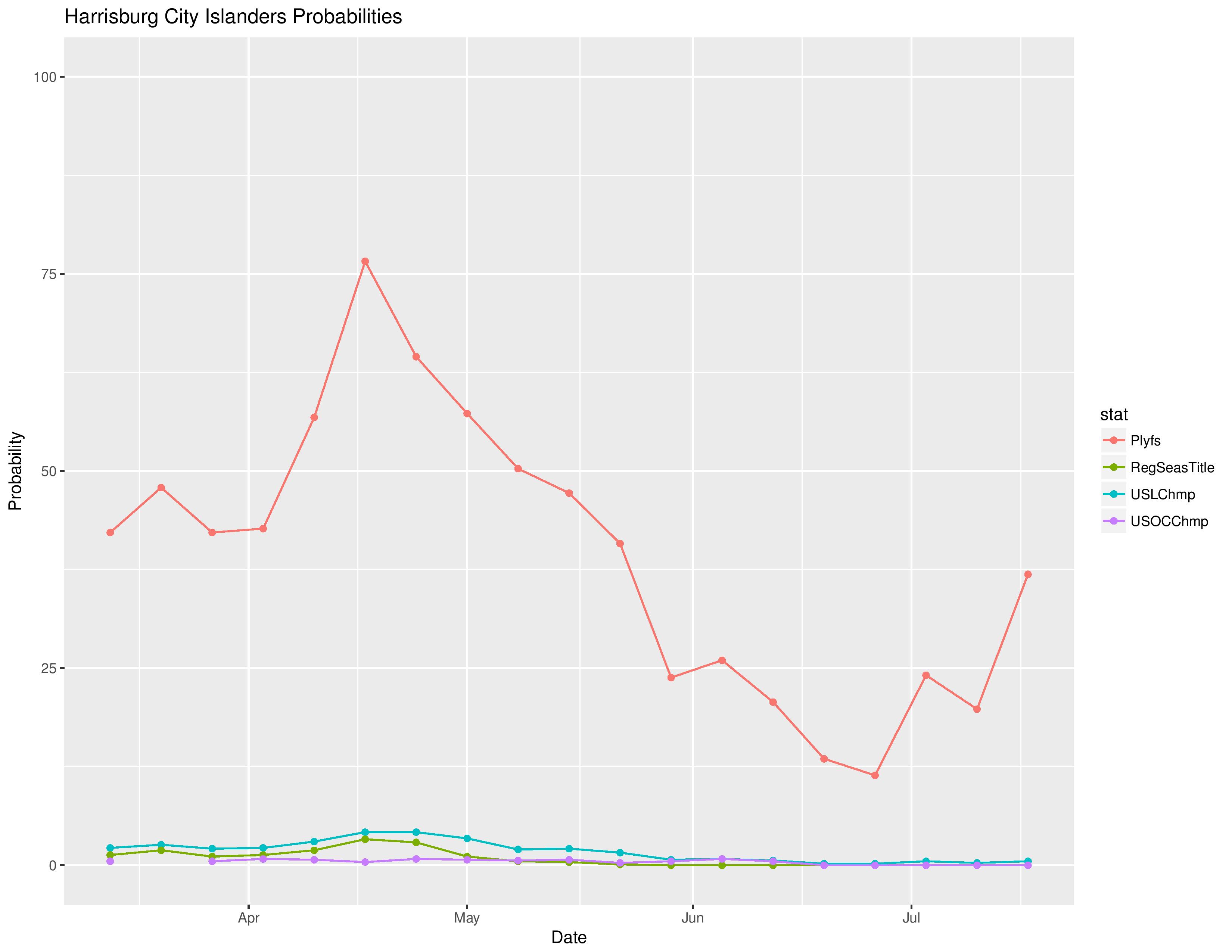 Bethlehem’s odds at becoming the USL Champion have decreased from 3.4% to 2.4% while Harrisburg City’s increased from 0.3% to 0.5%: