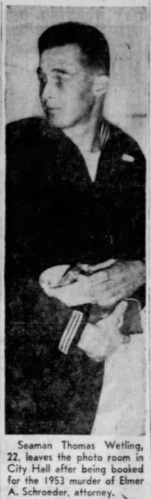 Almost exactly two years after he was murdered, Philadelphia police named a new suspect in Schroeder’s murder, Thomas C. Wetling Jr., a 22-year-old sailor assigned to the US Navy destroyer USS Hale. Wetling had been implicated in Schroeder’s murder by a person who was being questioned by the FBI in an unrelated investigation. According to the informant, Wetling and Schroeder knew each other, and after a night of drinking, Wetling accompanied Schroeder to his apartment where they quarreled “about money and other things” before Wetling committed the murder.
