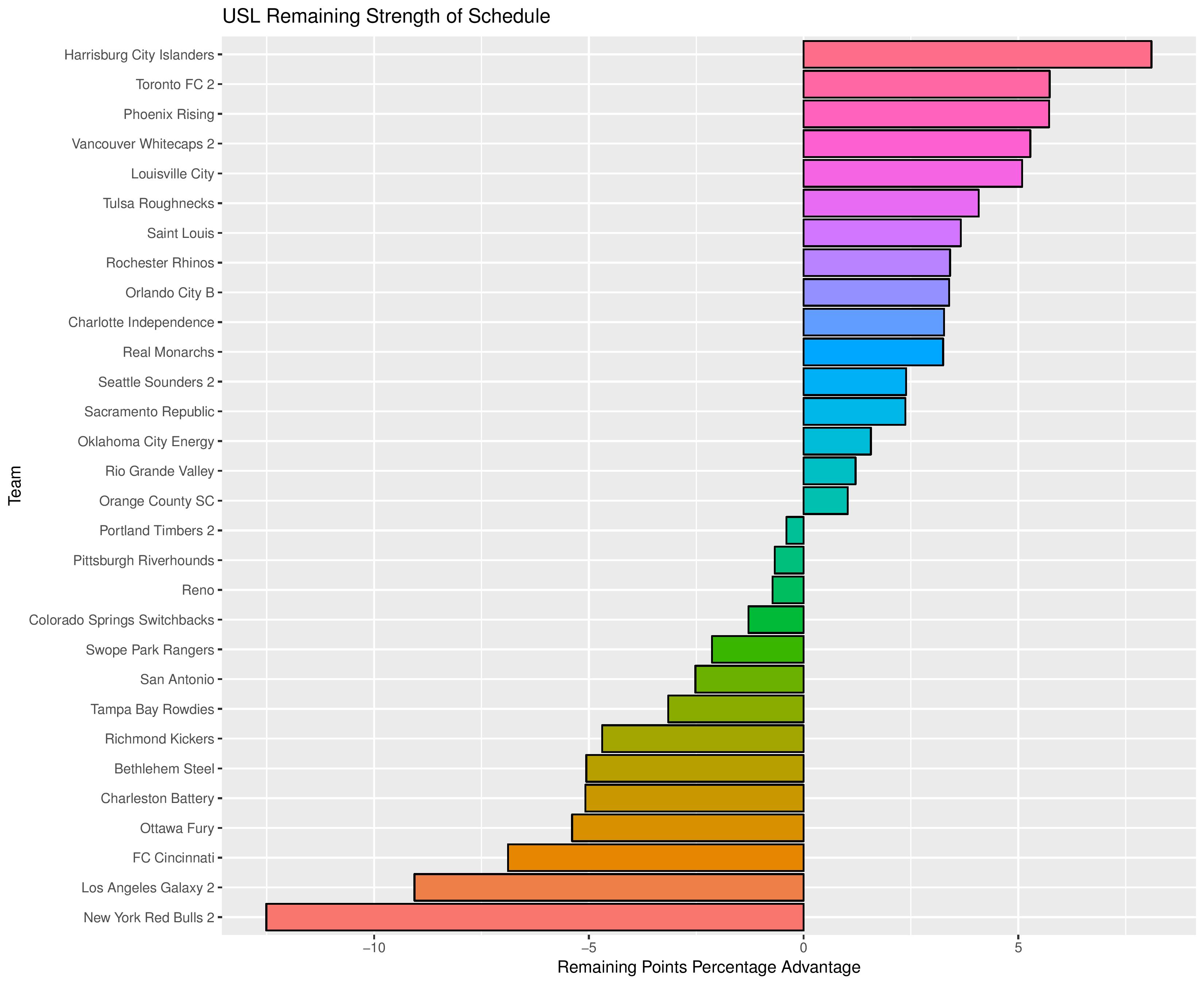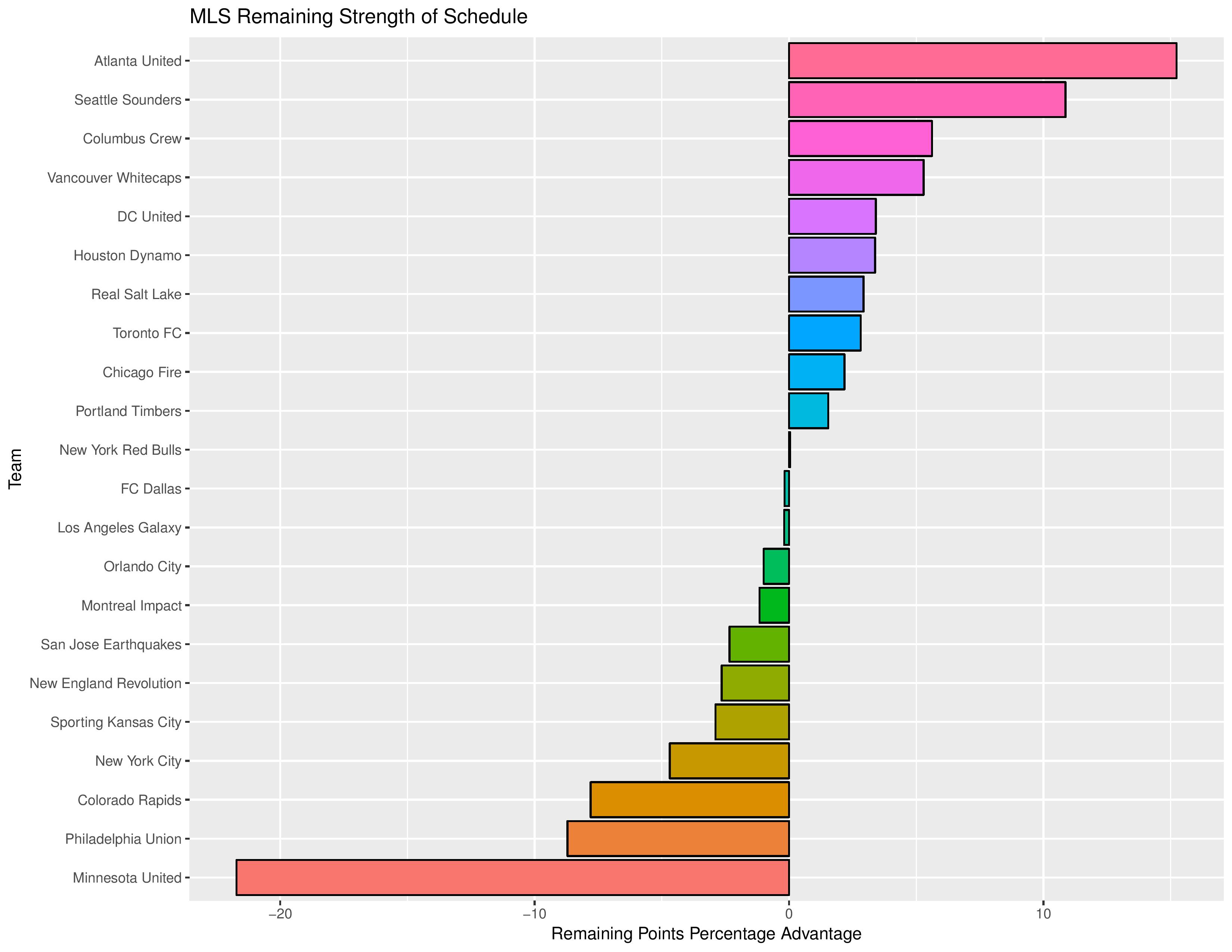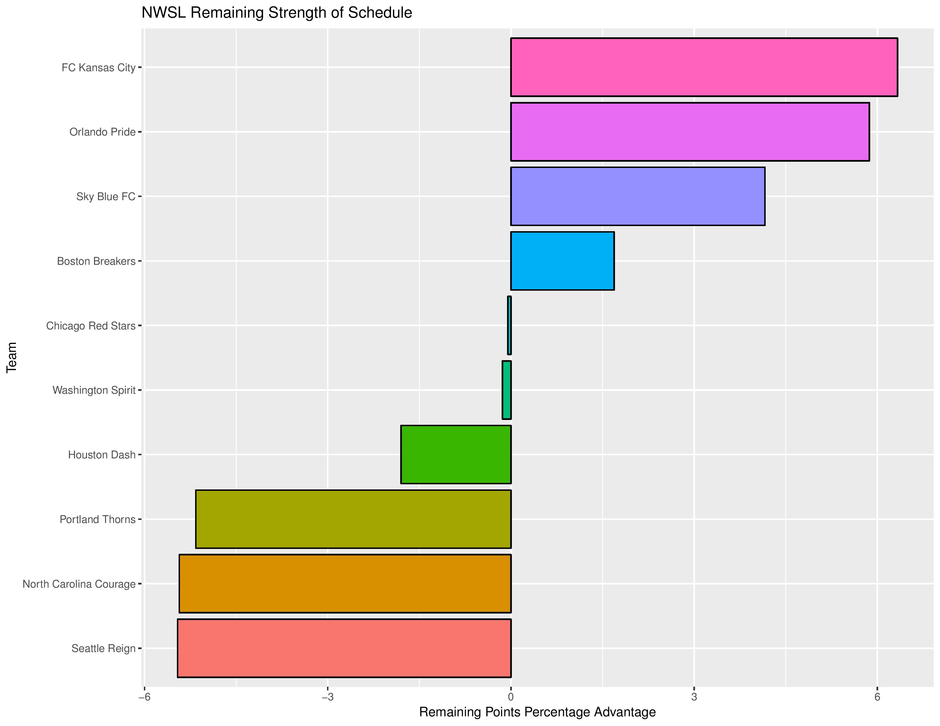 The “Points Percentage Advantage” shown on the X-axis represents the percentage of points expected over the league average schedule. This “points expected” value is generated by simulating how all teams would perform with all remaining schedules (and therefore judges a schedule based upon how all teams would perform in that scenario).