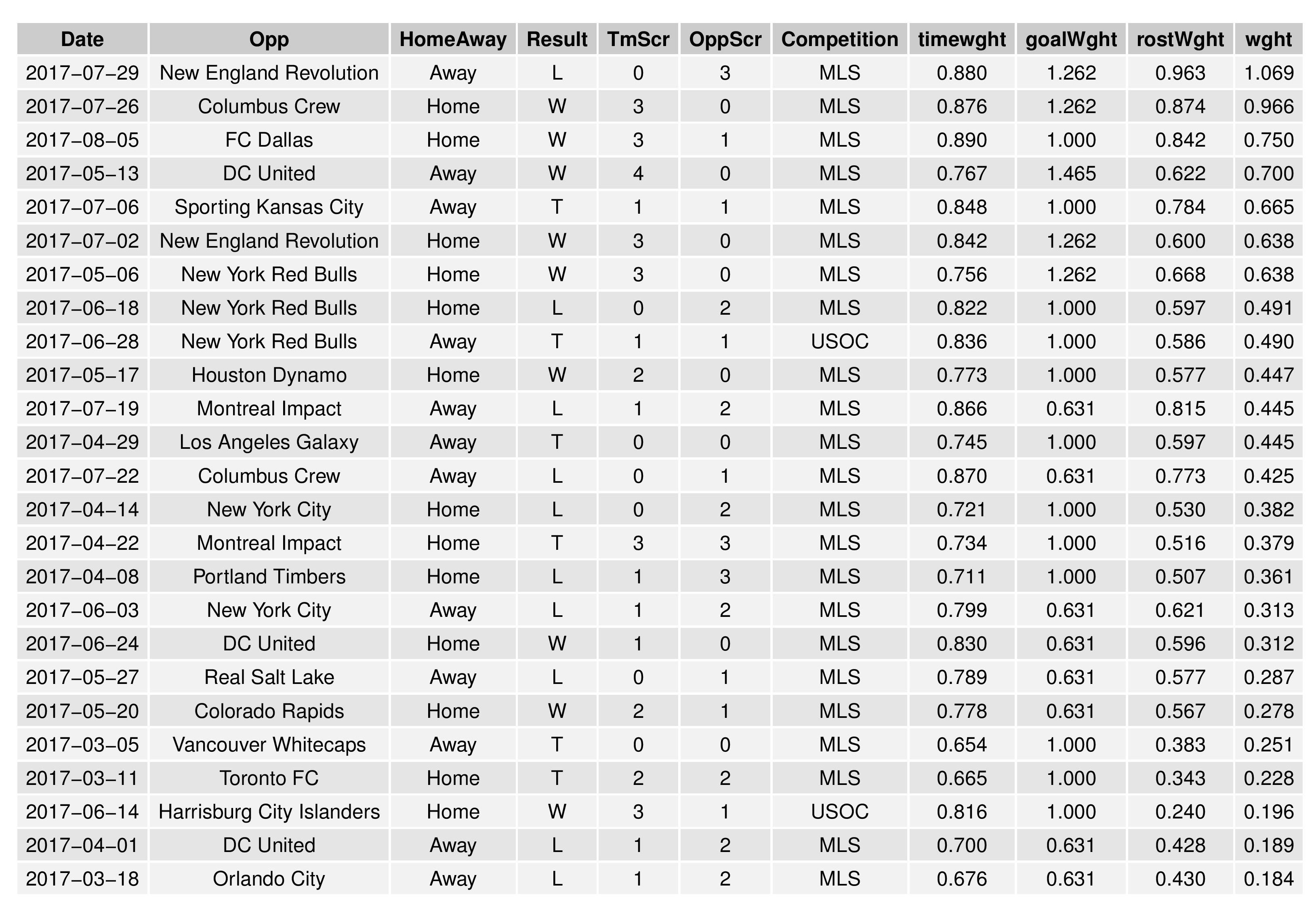 ‘wght’ is the actual weight value used in the model, which is a combination of the ‘timewght’ (how long ago the match occurred), ‘goalWght’ (how much luck could have influenced the match result, as indicated by the goal differential), and ‘rostWght’ (how similar the roster deployments for both teams were compared with current trends).