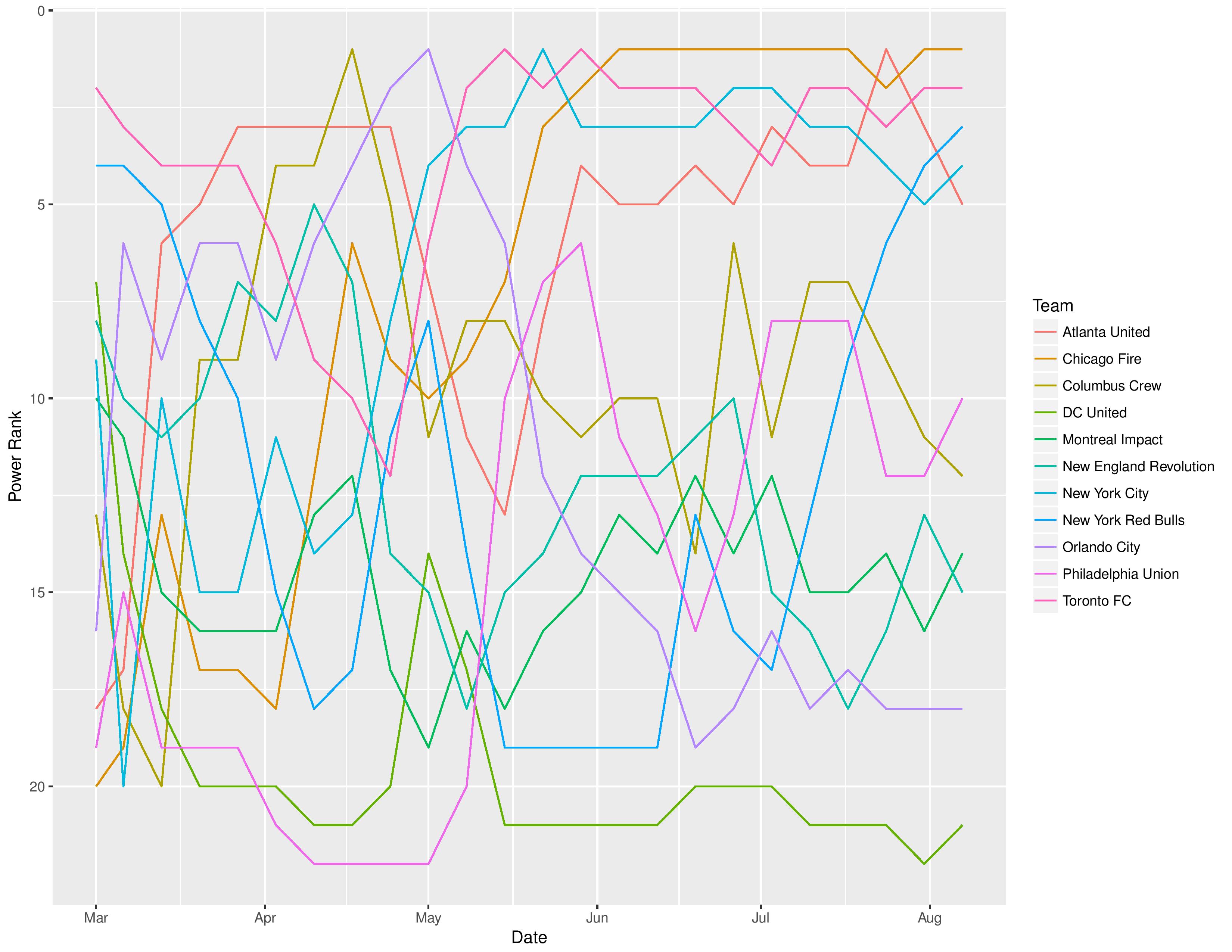 The following shows the evolution of SEBA’s power rankings for the MLS Eastern Conference over time: