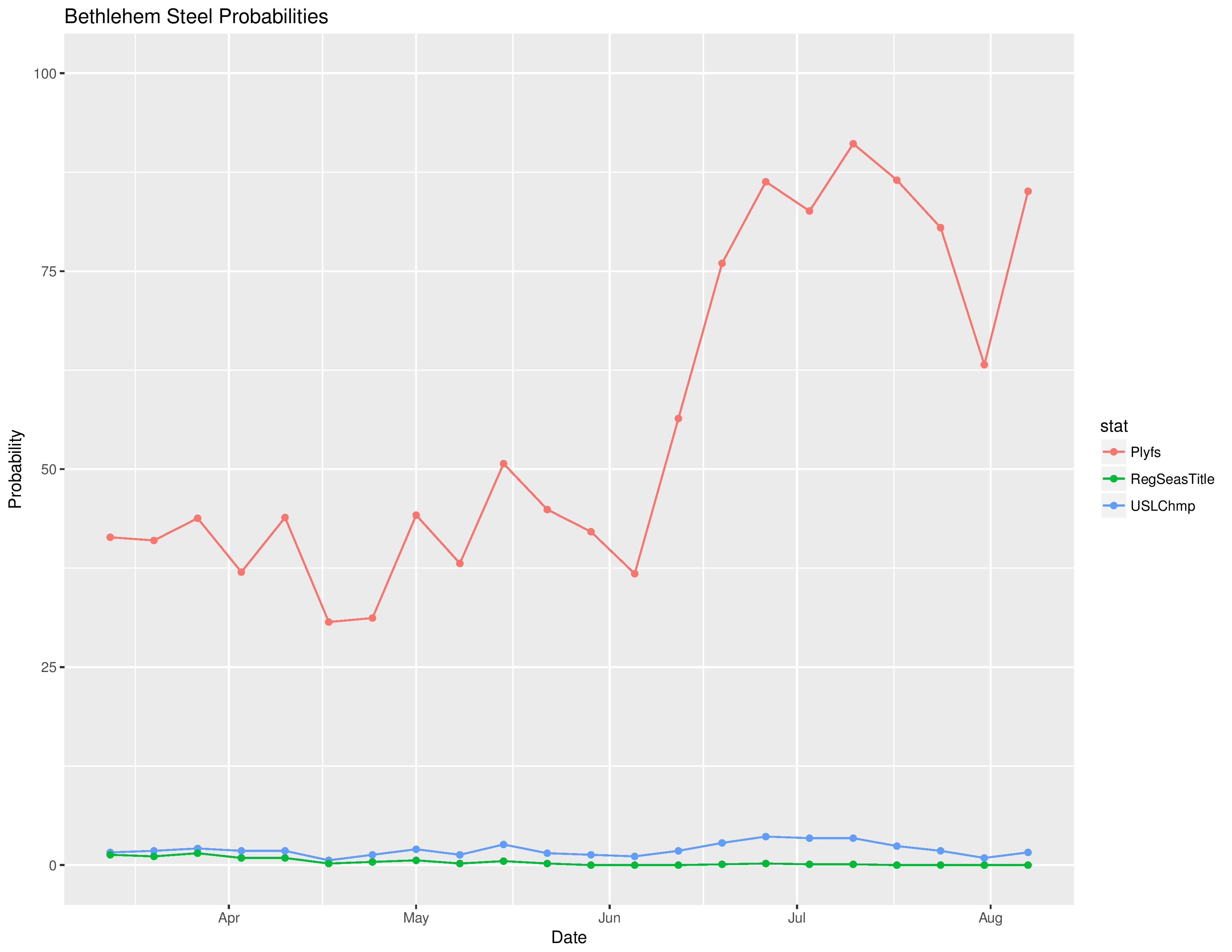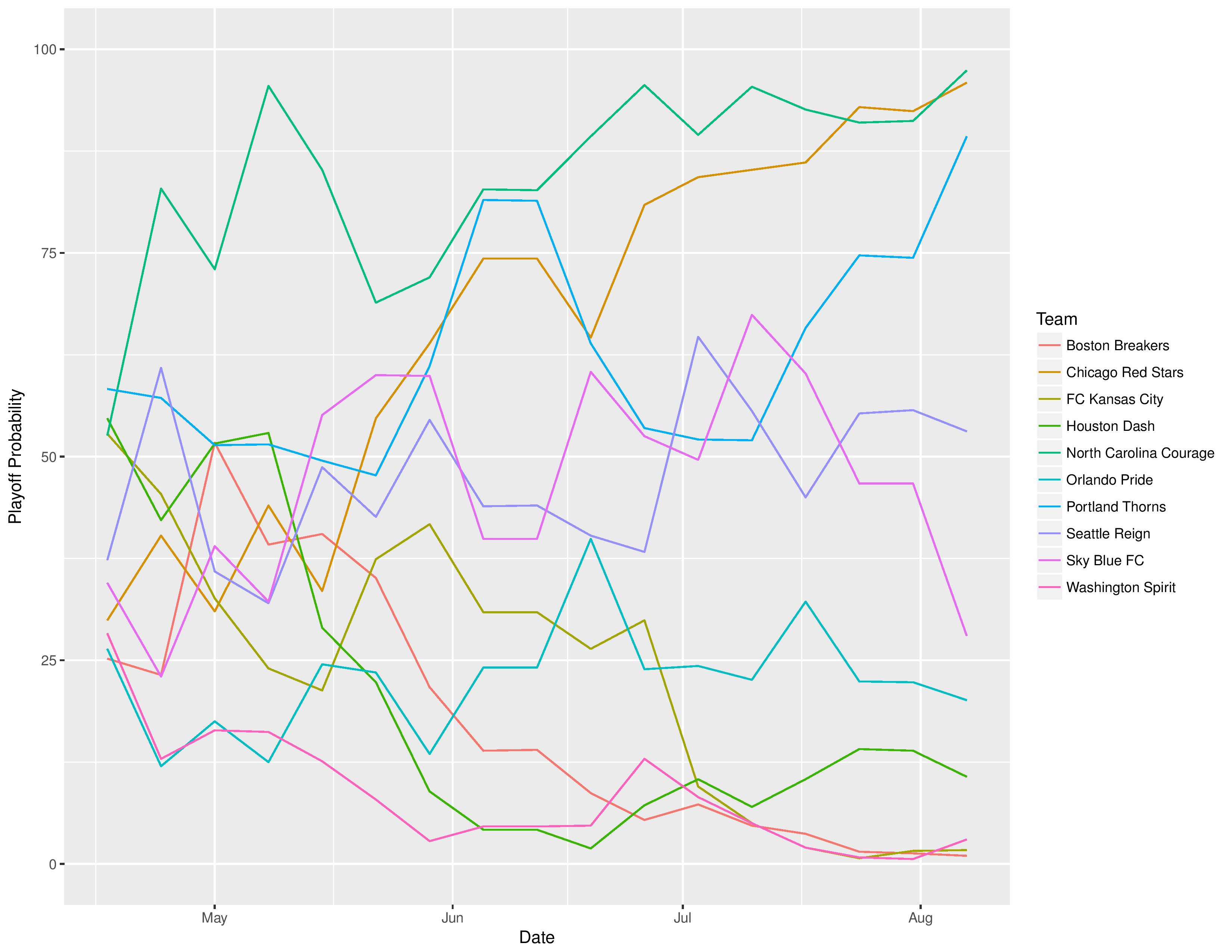 For the following, the green line represents the odds of a win, the blue line the odds of a tie, and the red line the odds of a loss.