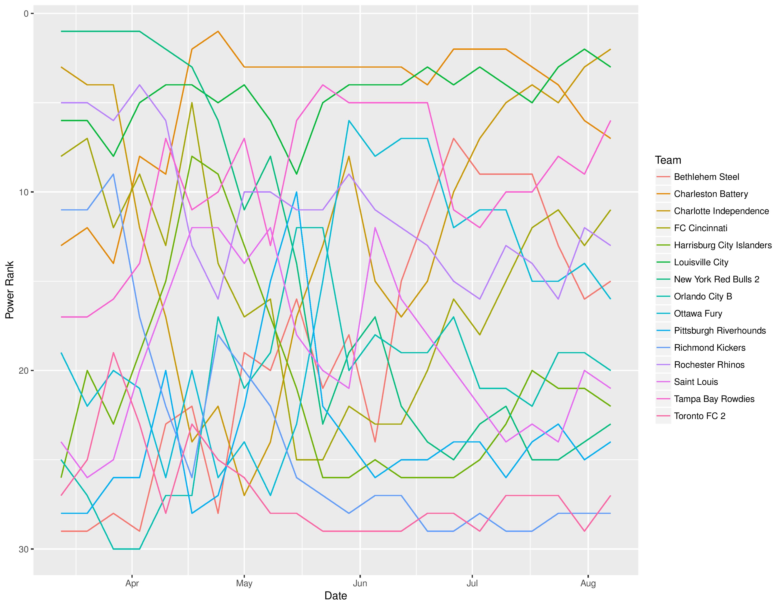 The following shows the evolution of SEBA’s power rankings for the USL East over time.