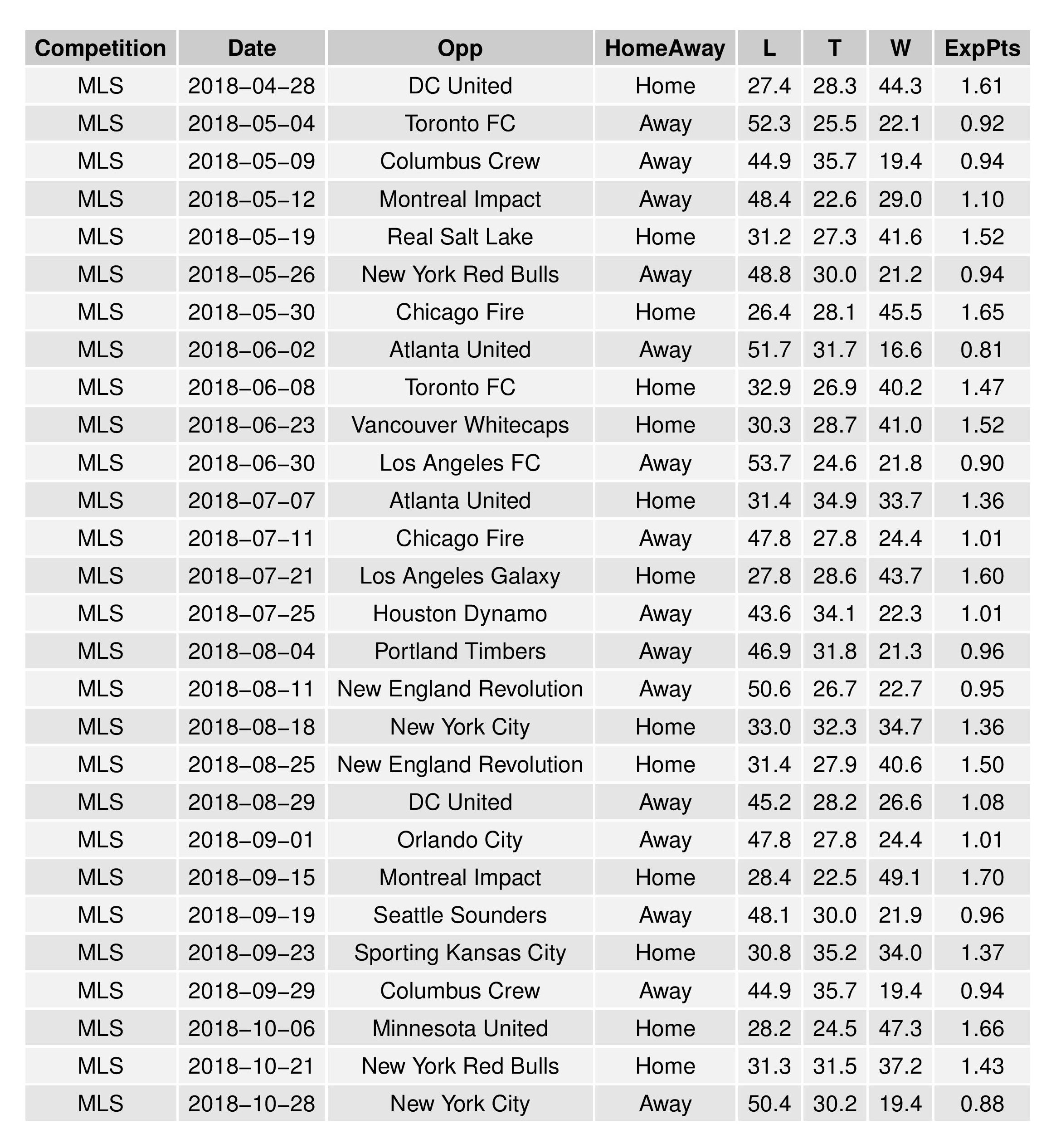 | Montreal Impact | East | -1.1 | -0.3 | 0.5 | -0.1 | -1.3 | -0.9 | -0.5 | 1 | -0.024 | -7.9 | 0 | 0 | NA | 0 | 0 | NA | 0.1 | 1.3 | 1.3 |