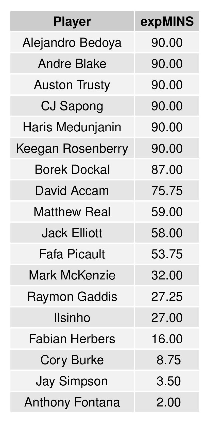 | CJ Sapong | -6 | 31 | 37 | 2321 | -0.233 | 1.202 | 1.435 |