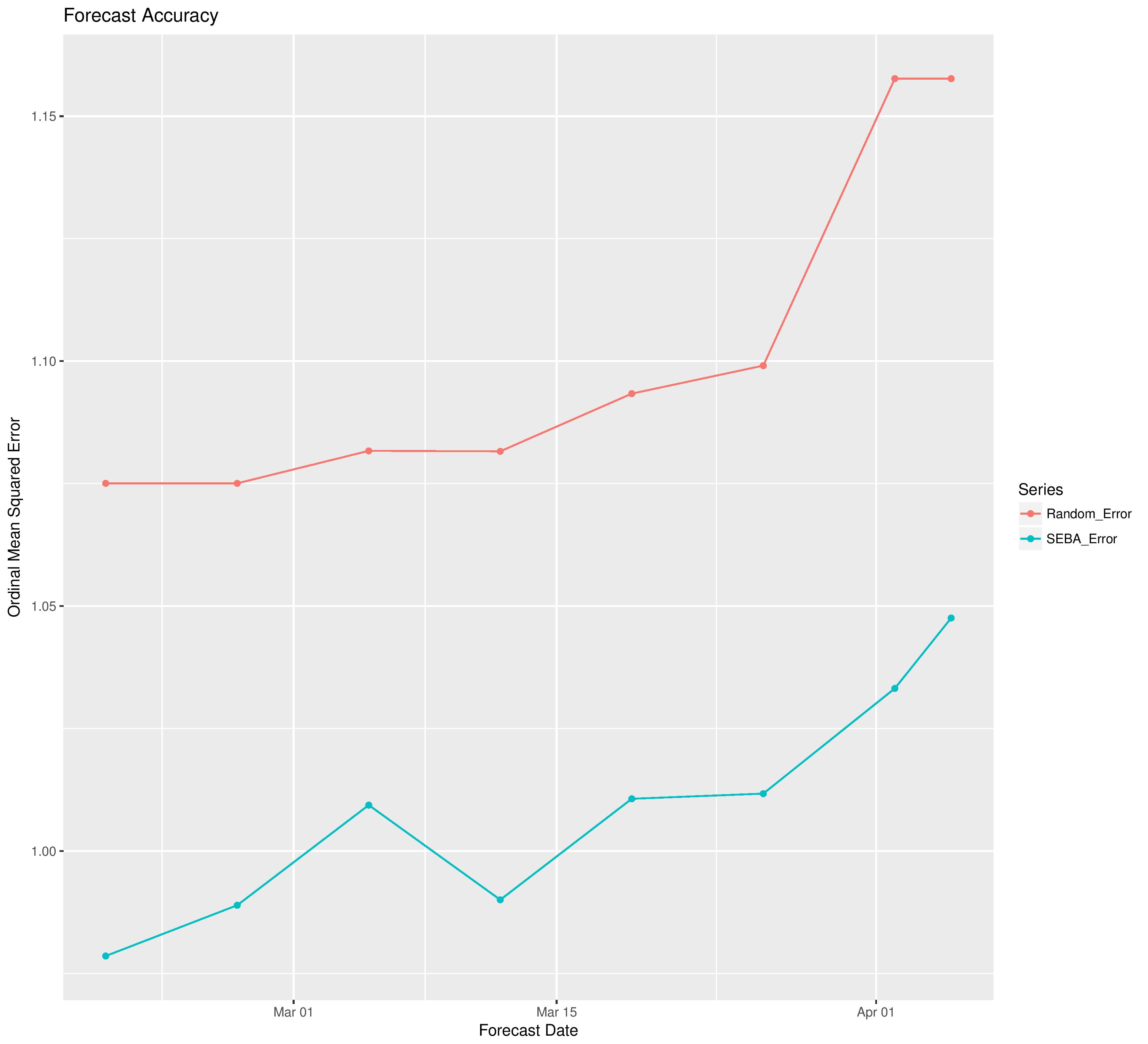 The following shows SEBA’s model error compared with random guessing. To do this, we save forecasts for the entire season’s games for every forecast’s data, and update the error charts all the way through the season.