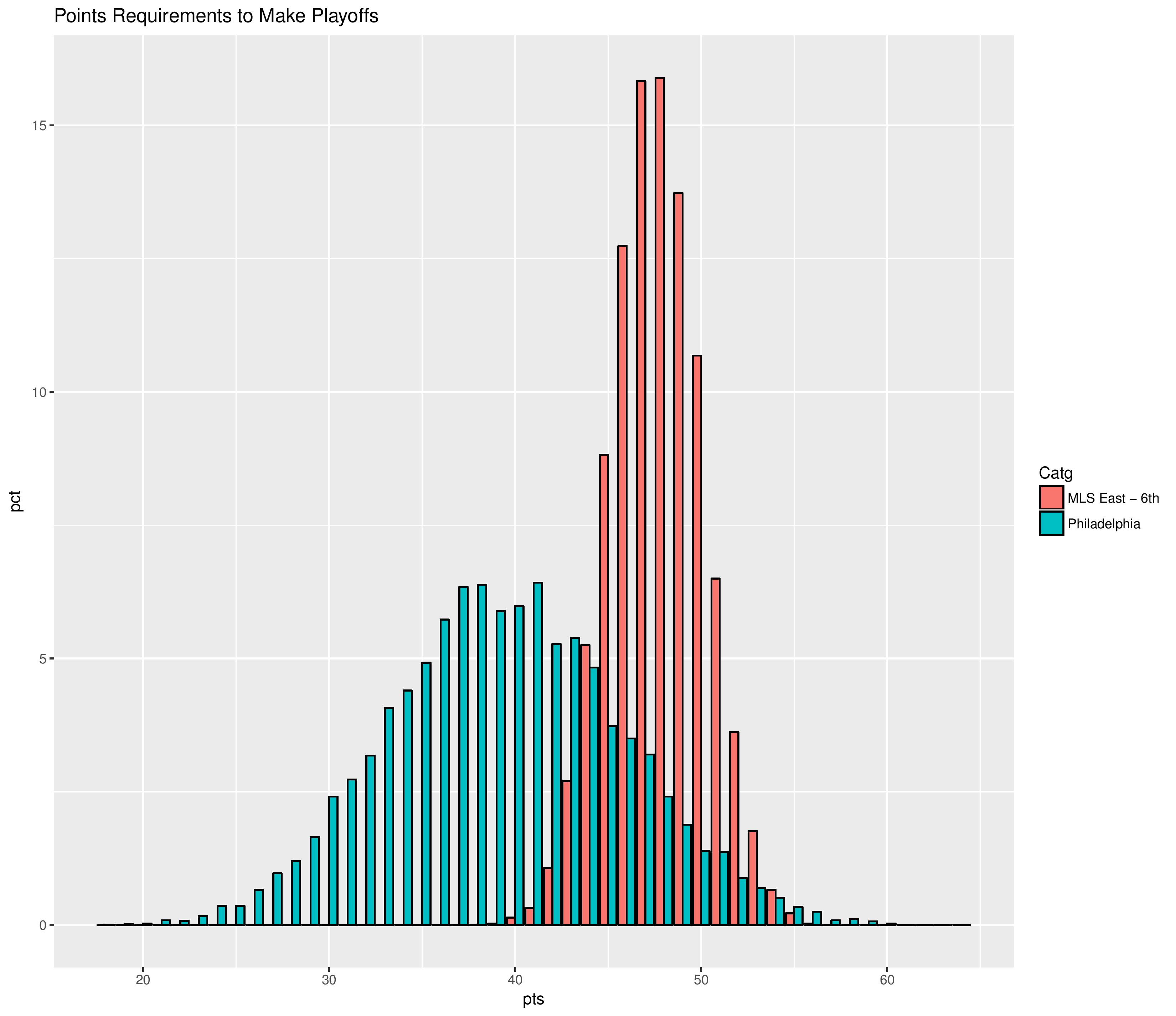 Next is the distribution of Philadelphia’s points against the MLS East’s sixth seed in all the simulations.