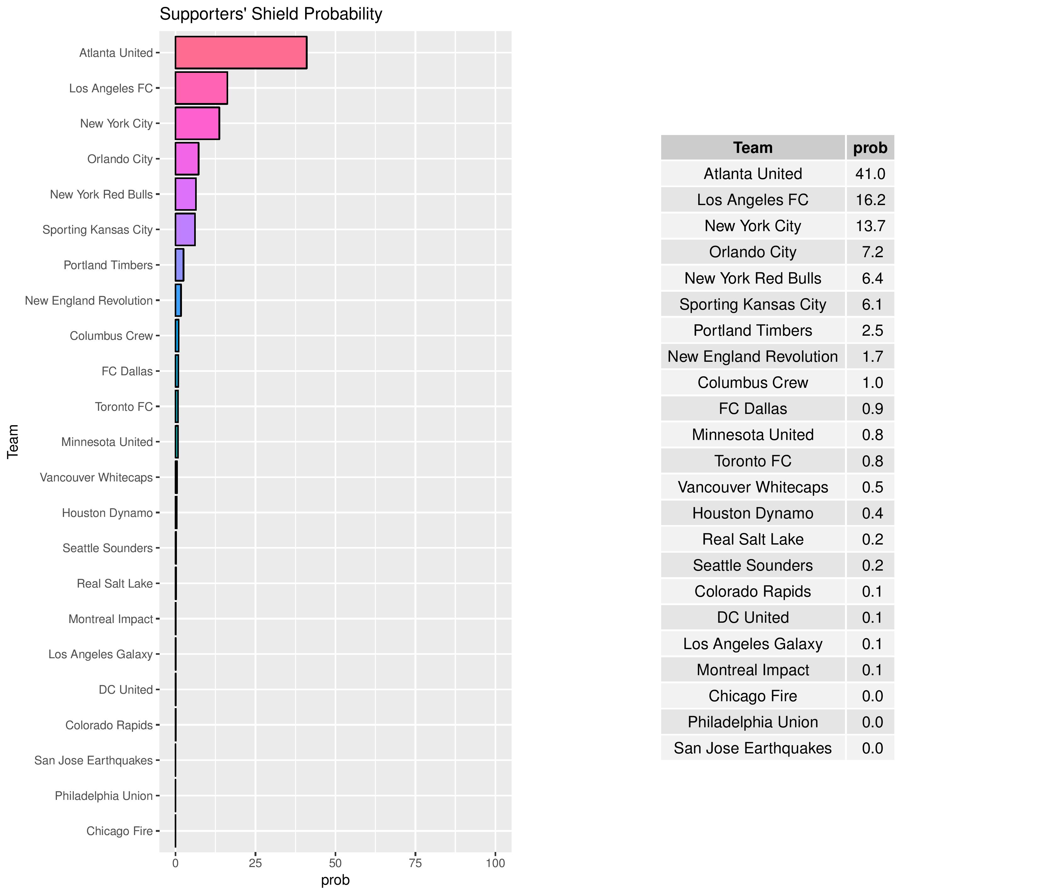 Philadelphia decreased from 0.1% to a 0% chance of winning the Supporters’ Shield.
