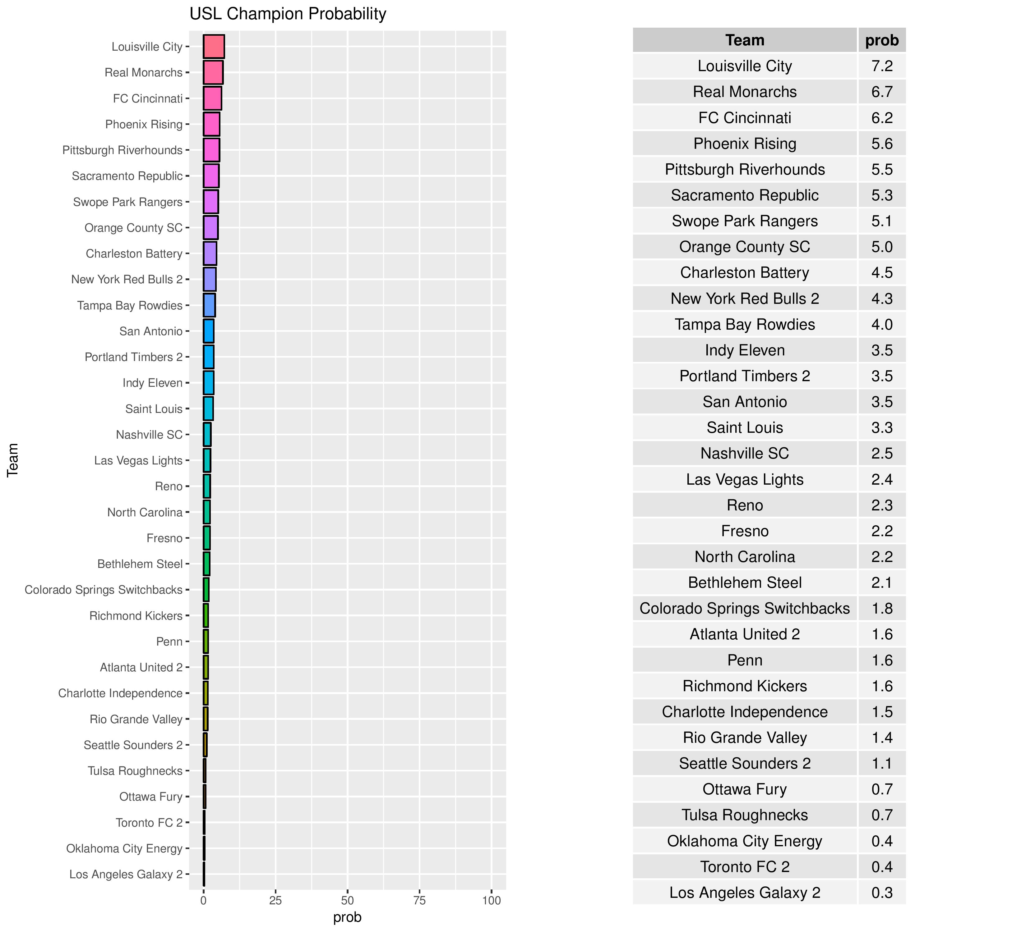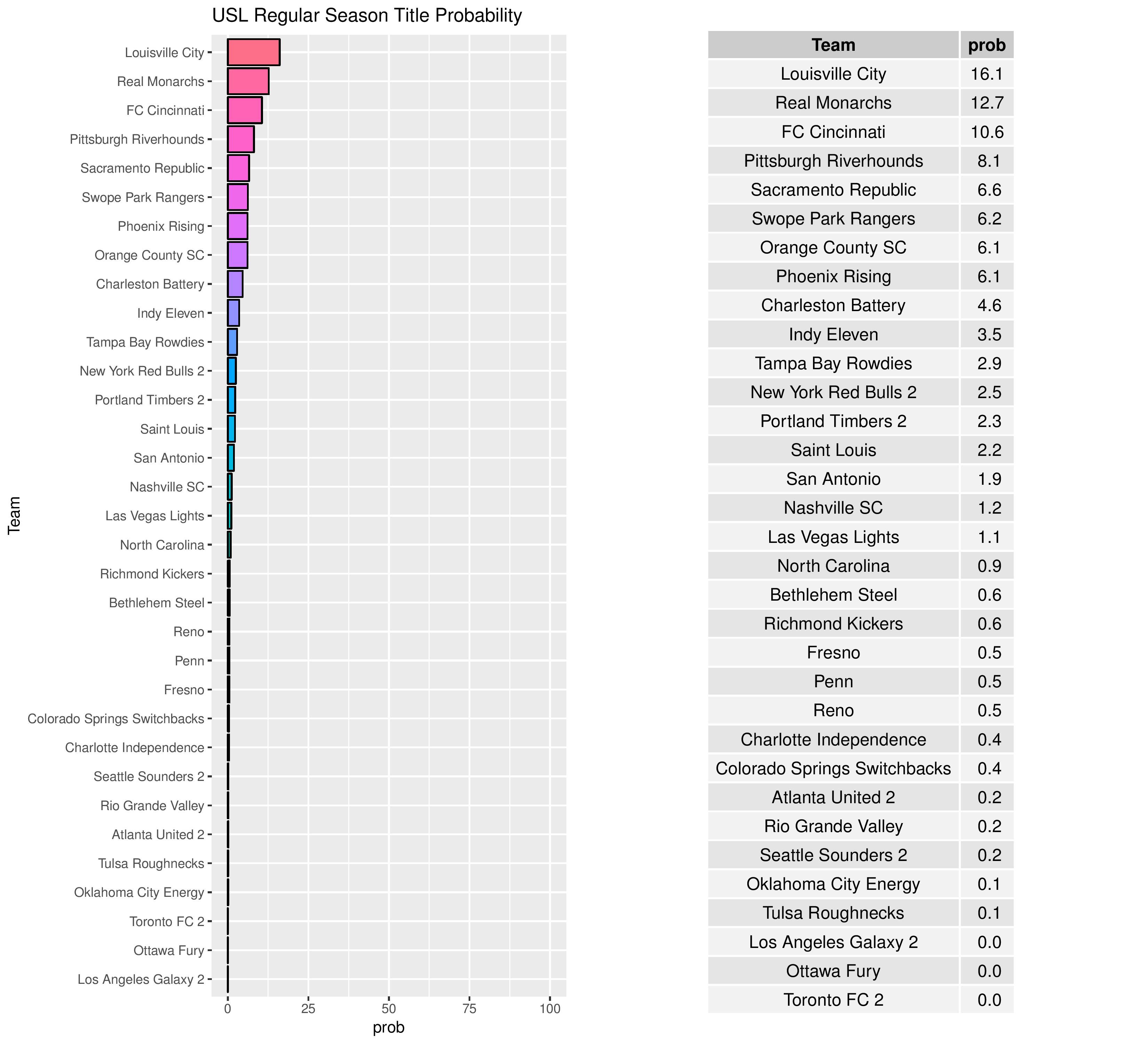 Bethlehem increased from a 0.3% to a 0.6% chance of claiming the USL regular season title from the last published forecast.