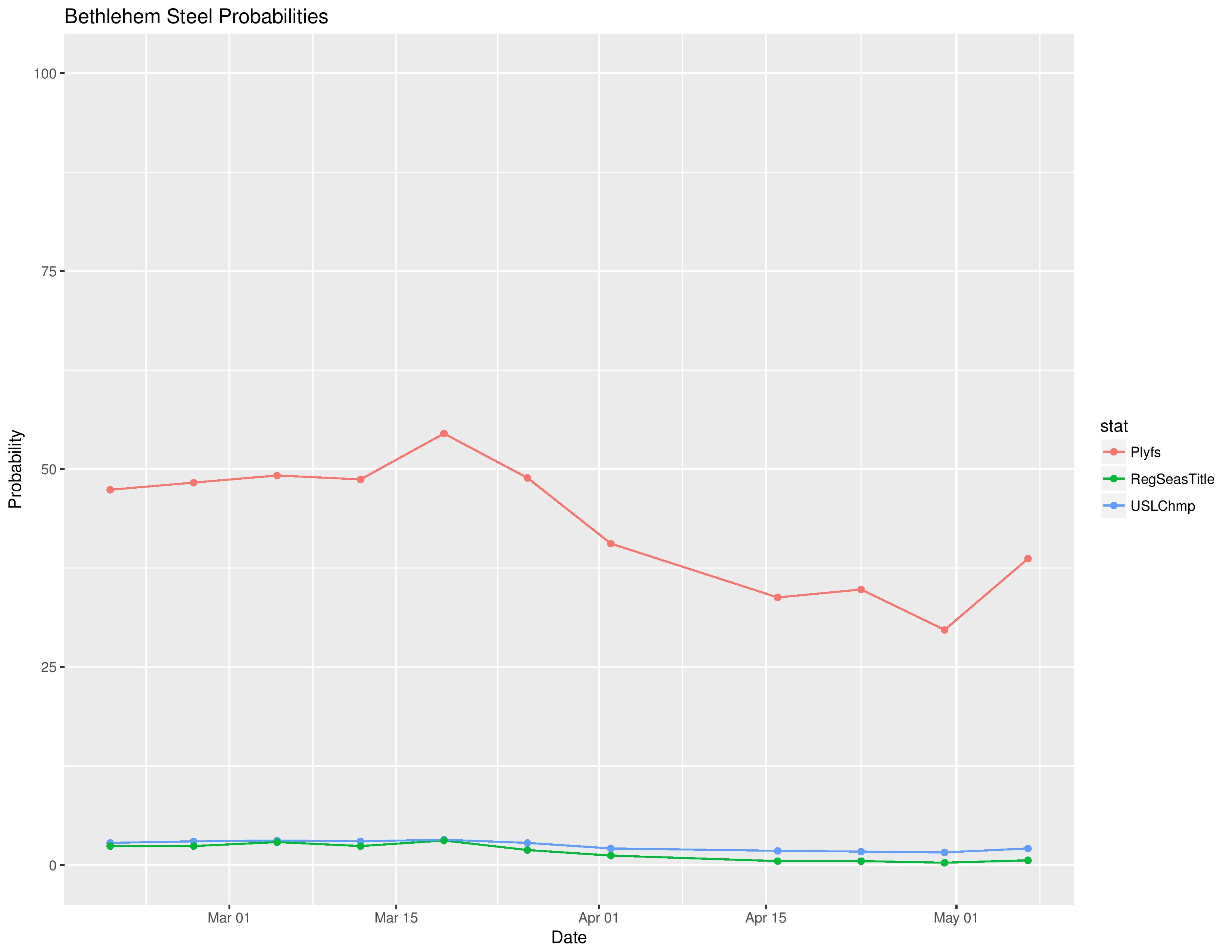 - Bethlehem playoff chances: The Steel are up to a 38.7 percent chance to make the USL playoffs.