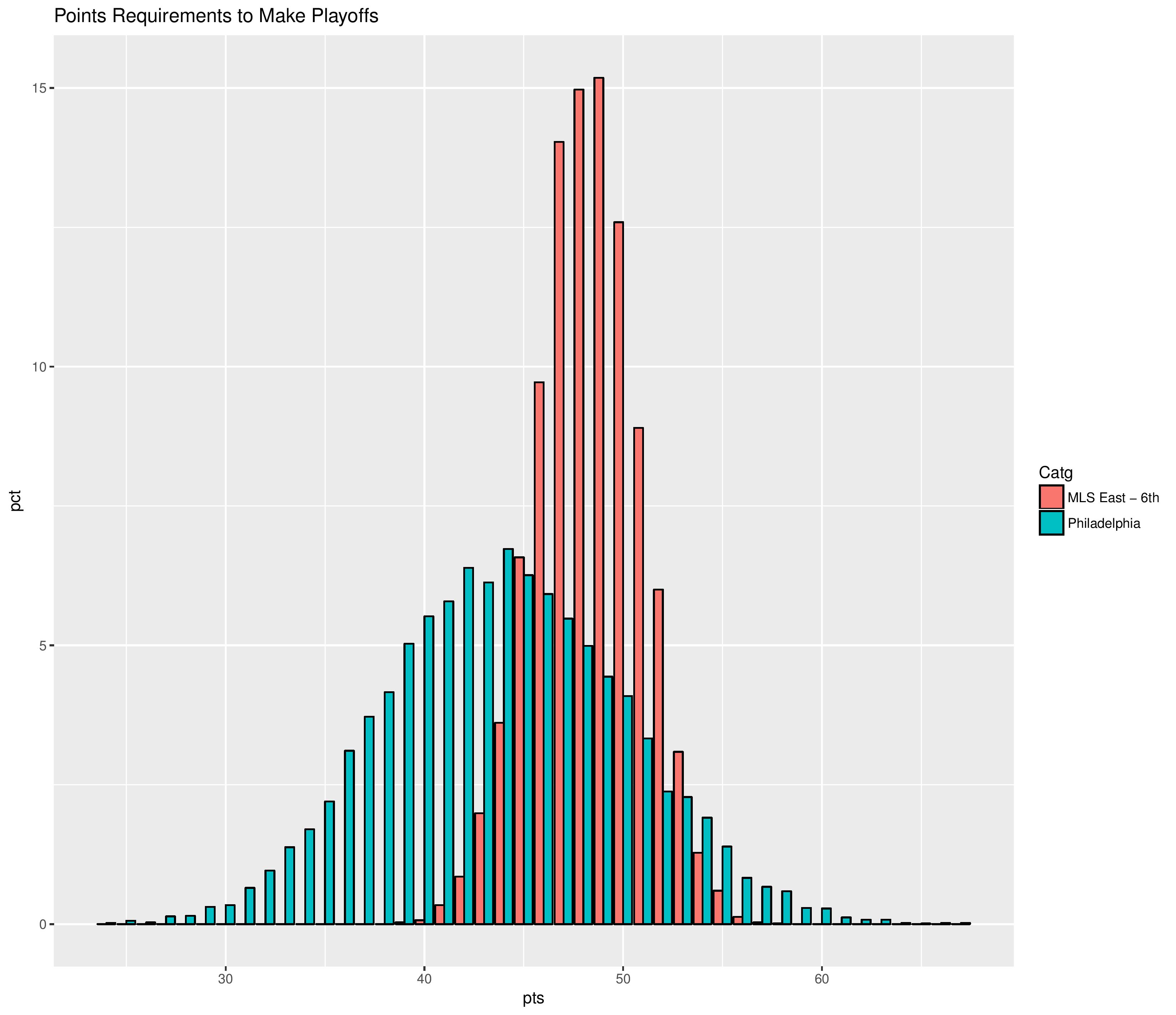 Next is the distribution of Philadelphia’s points against the MLS East’s sixth seed in all the simulations.