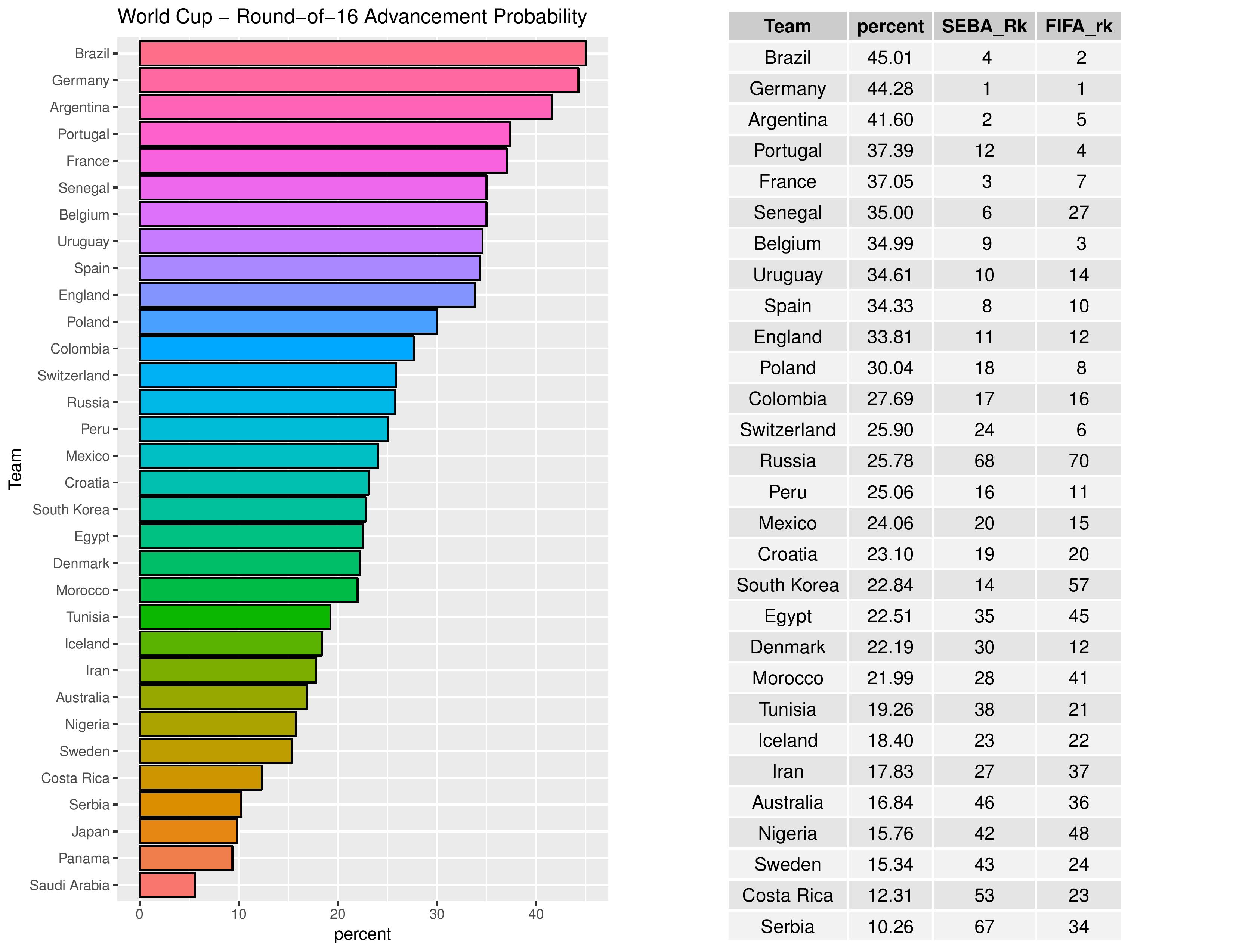 The following are the probabilities of each team for winning the World Cup, accompanied by their SEBA ranking and FIFA ranking.