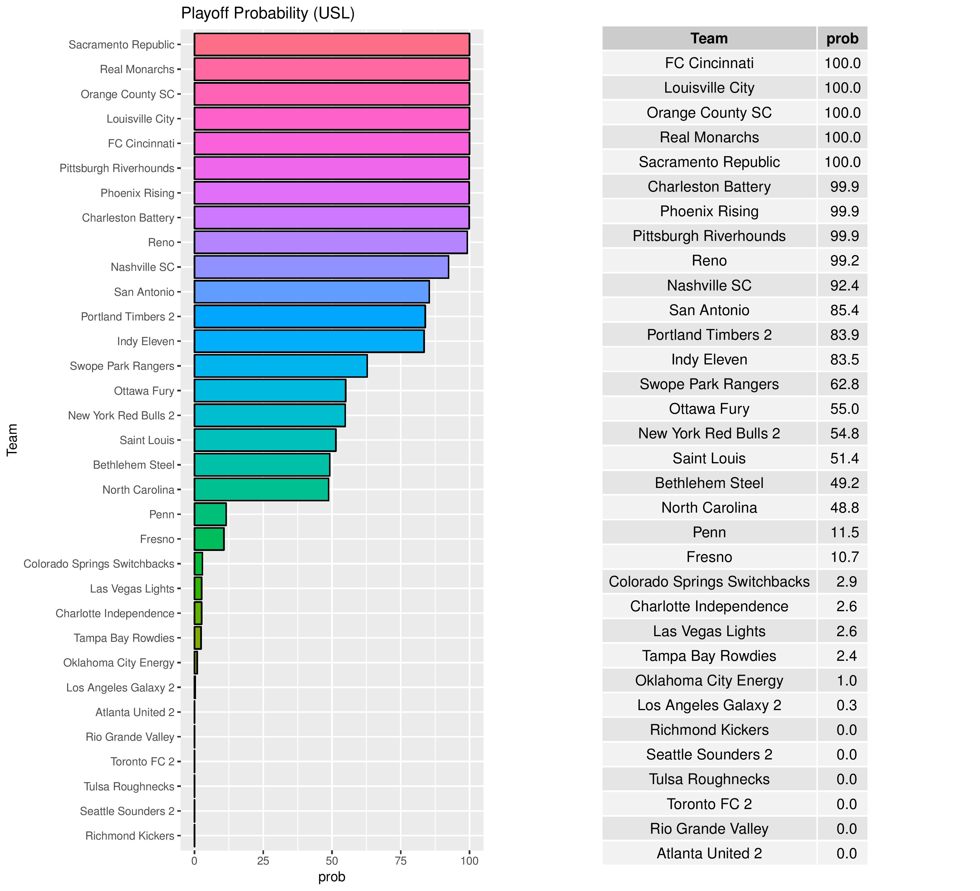 - Bethlehem playoff chances: The Steel have a 49.2% chance to make the USL playoffs, up from 40.0%.