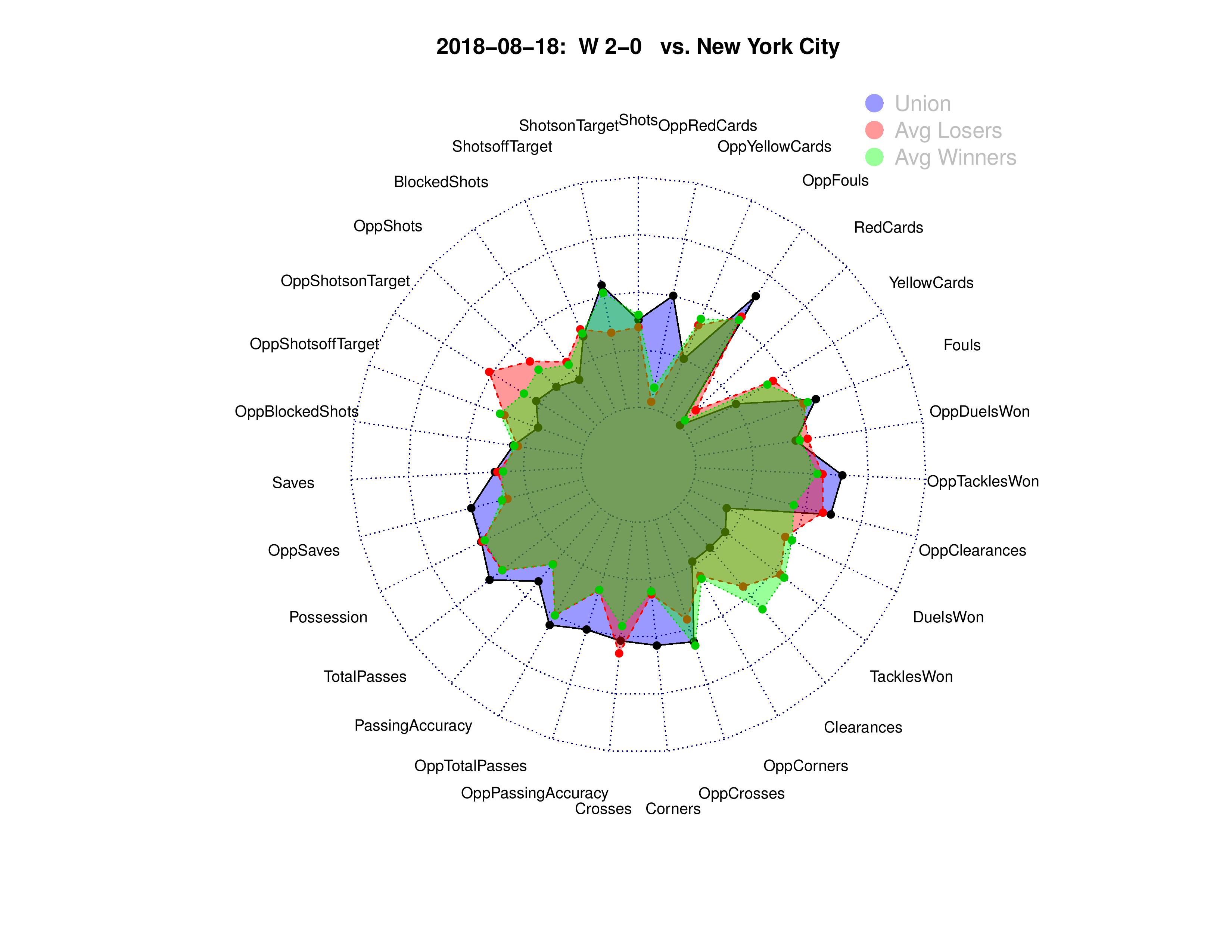 This following chart shows the Union’s stats in recent MLS matches, as compared with typical winning and losing teams.