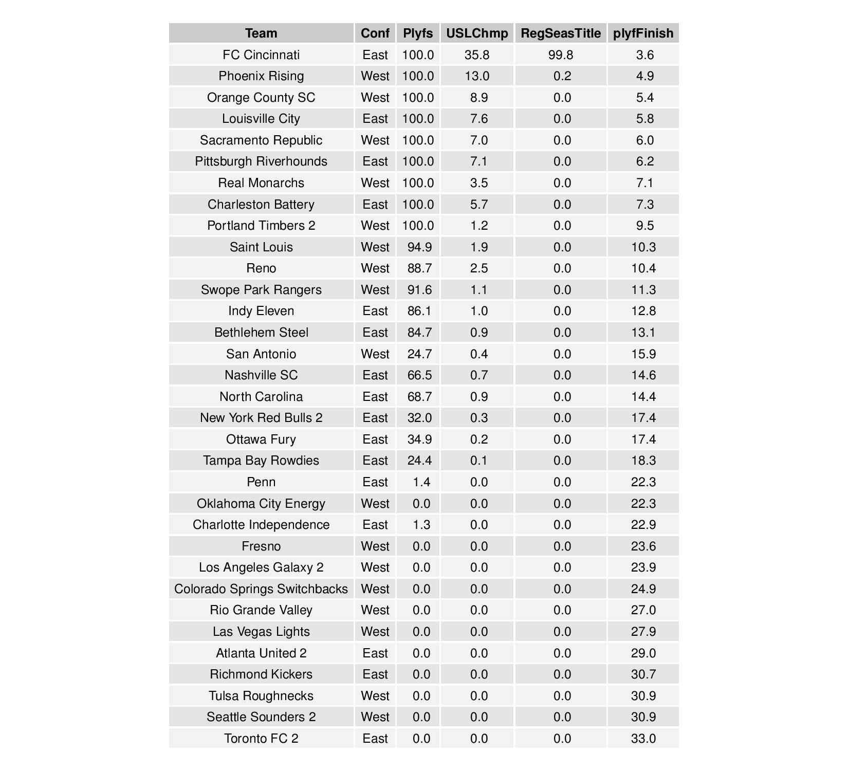 Bethlehem’s odds of winning the USL championship increased from 0.8% to 0.9%.