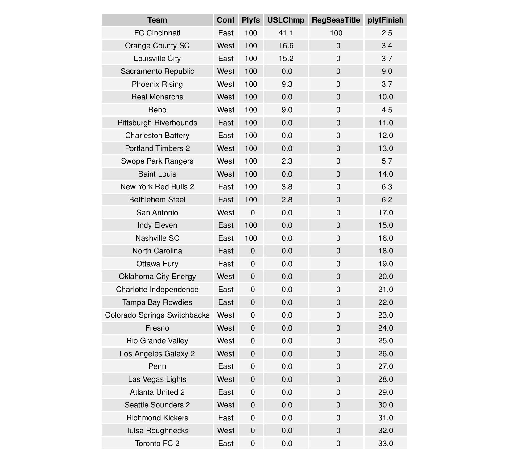 Bethlehem’s odds of winning the USL championship increased from 1.4% to 2.8%.