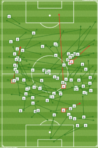 On the left is the Minnesota map. There’s barely any red to be found, indicating that Medunjanin completed passes at a high clip. He’s also taking advantage of the width of the pitch, getting in good spots for the backline in his own half while sliding in to the channels in the attacking third.
